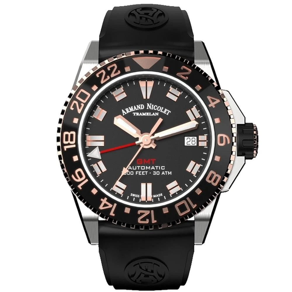 Black/Rose Gold Guilloché Dial – Luminous Indexes and Hands – Red and Silver GMT Hand