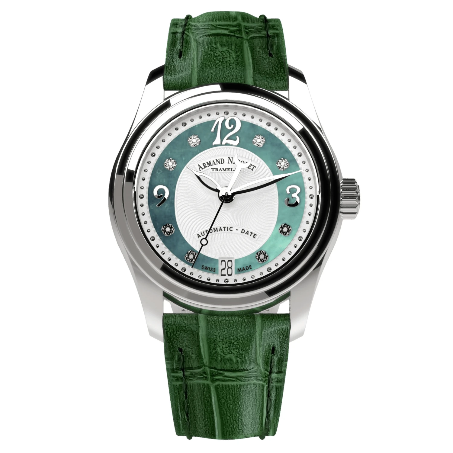 Silvered Guilloché Decorated Dial Inserted with Green Mother of Pearl – Applied Hour, Minute, and Seconds Hands with Applied Arabic Numbered Indexes – Diamond-Cut Dots and Hour Indexes – Date at 6 O’Clock.