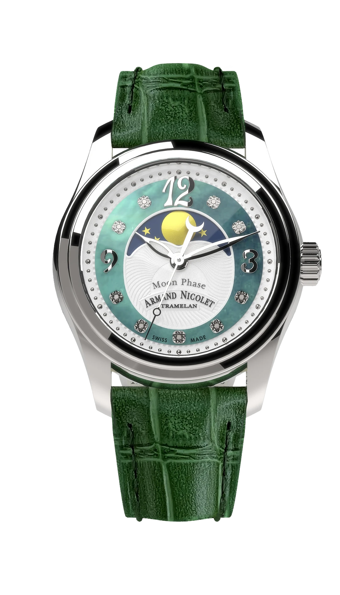 Dial: Silver Green MOP Dial – Guilloché Decorated Dial Inserted With Mother Of Pearl – Applied Indexes And Diamond Cut Dots And Hands.