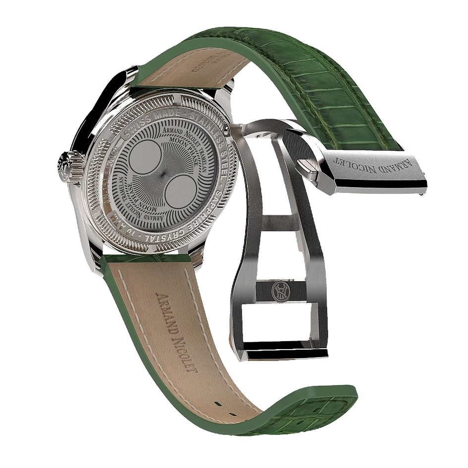 Strap / Bracelet: 18mm Green Alligator-Embossed Leather Strap On Stainless Steel 316L Deployment Buckle.