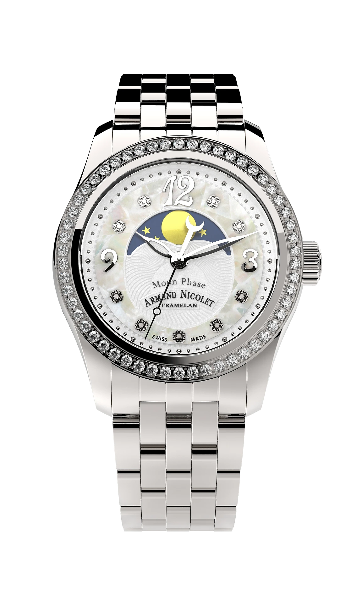 Case: 34mm x 11.25mm Case Size – Stainless Steel 316L Set With 54 Diamonds – Sapphire Crystal With Inside Antiglare Treatment And Sapphire Crystal On Screwed Back