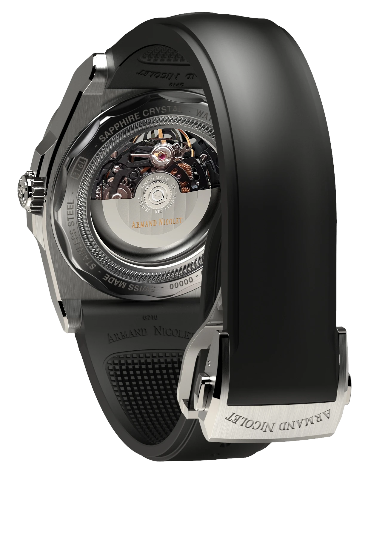 Strap / Bracelet: Black Rubber Strap – 316L Stainless Steel Deployment Buckle.
