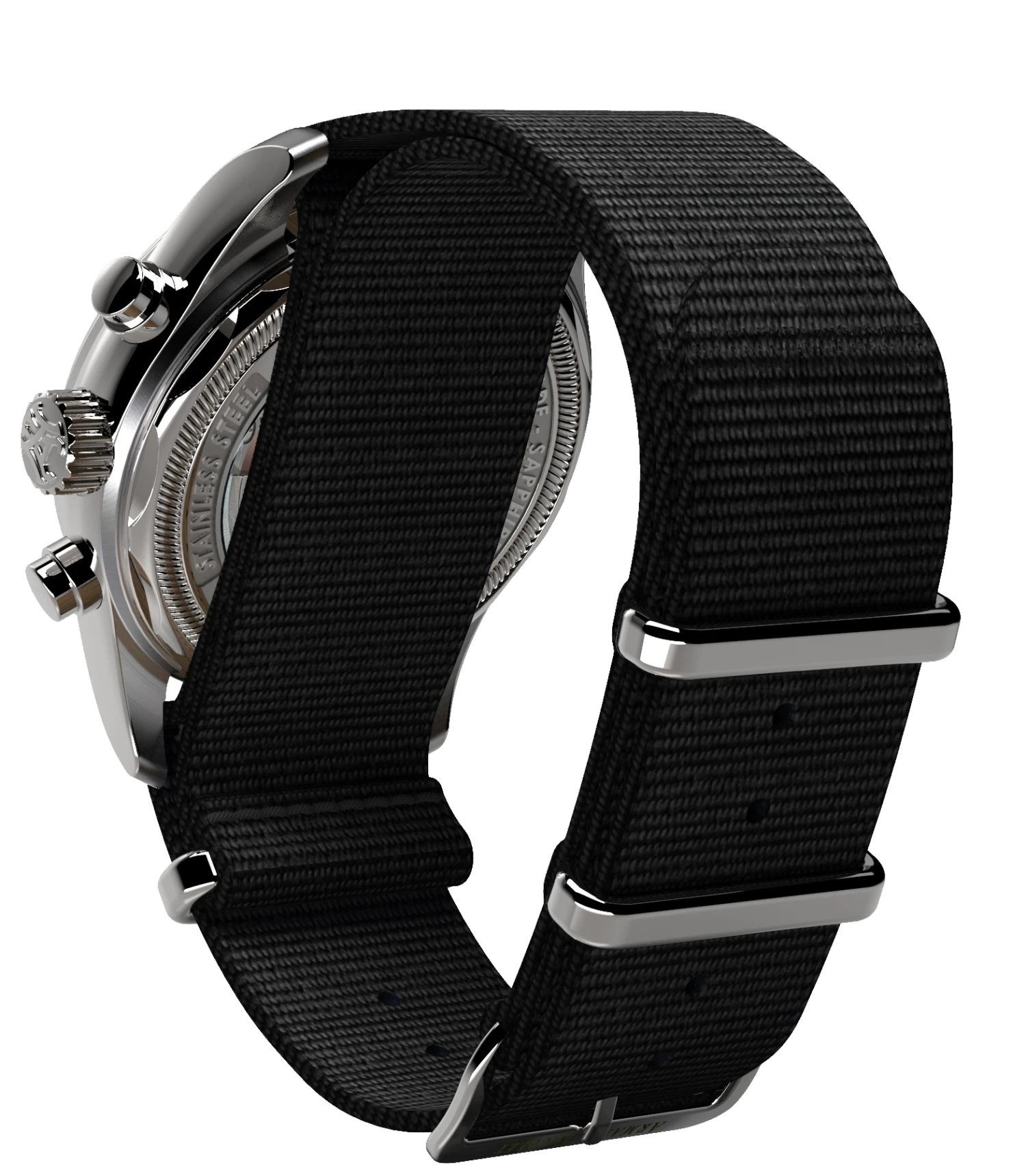 Strap / Bracelet: Black NATO Strap with 316L Stainless Steel Tang Buckle.