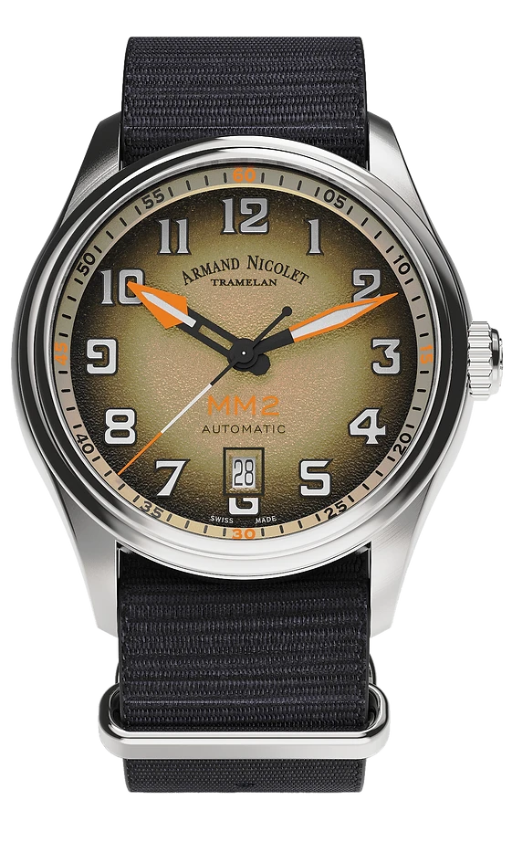Dial: Beige And Orange Dial – Raised Arabic Numerals – Date Window at 6 O’Clock – Dégradée Volcanic Sand Dial With Raised Arabic Numeral Markers. Luminescent Hands And Markers.