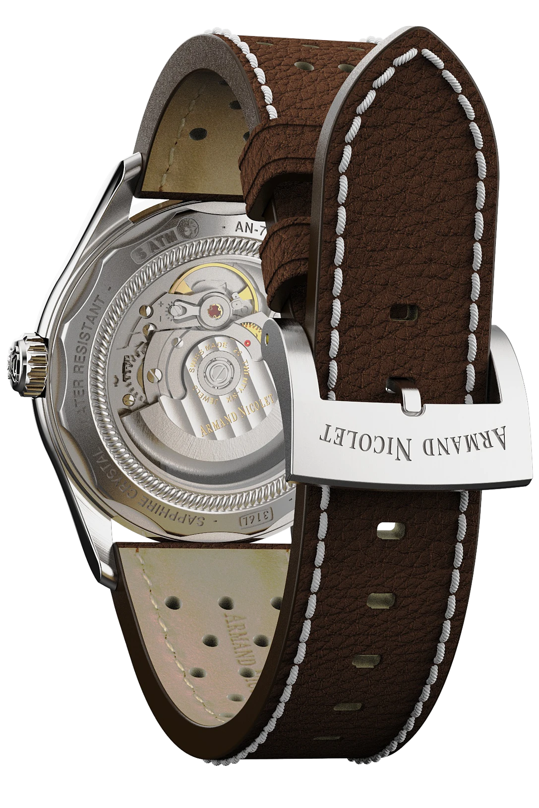 Strap / Bracelet: Brown Leather Strap With 316L Stainless Steel Tang Buckle.