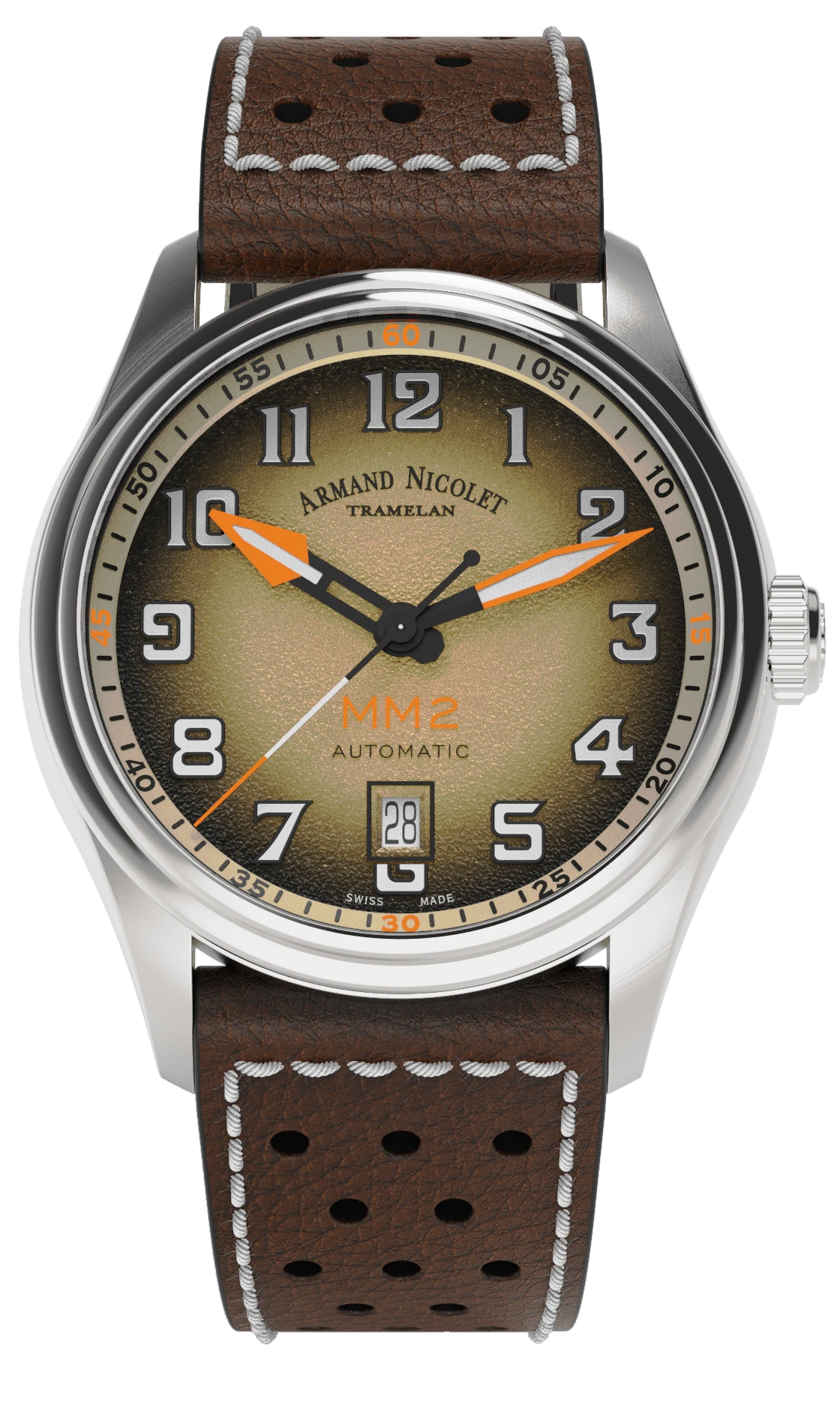 Dial: Beige And Orange Dial – Raised Arabic Numerals – Date Window at 6 O’Clock – Dégradée Volcanic Sand Dial With Raised Arabic Numeral Markers. Luminescent Hands And Markers.