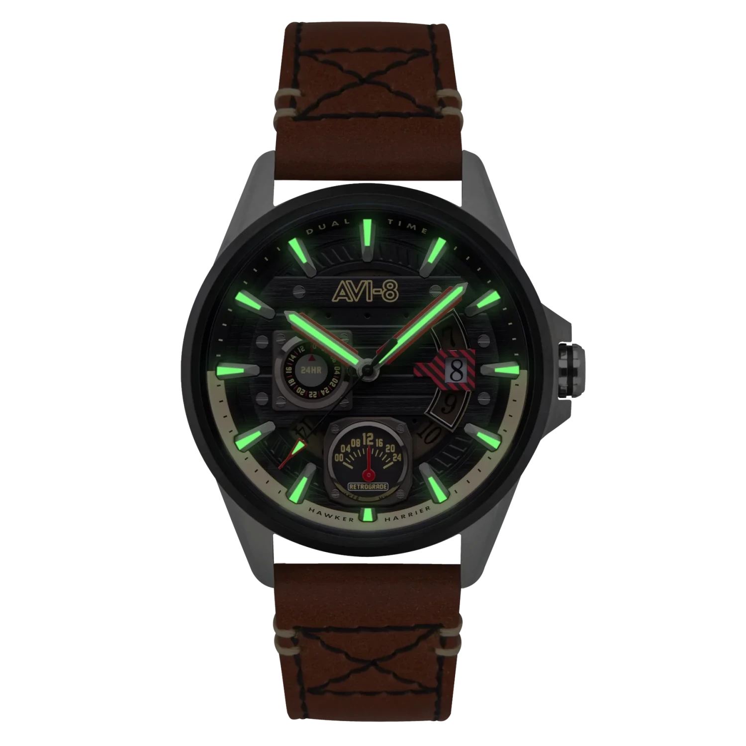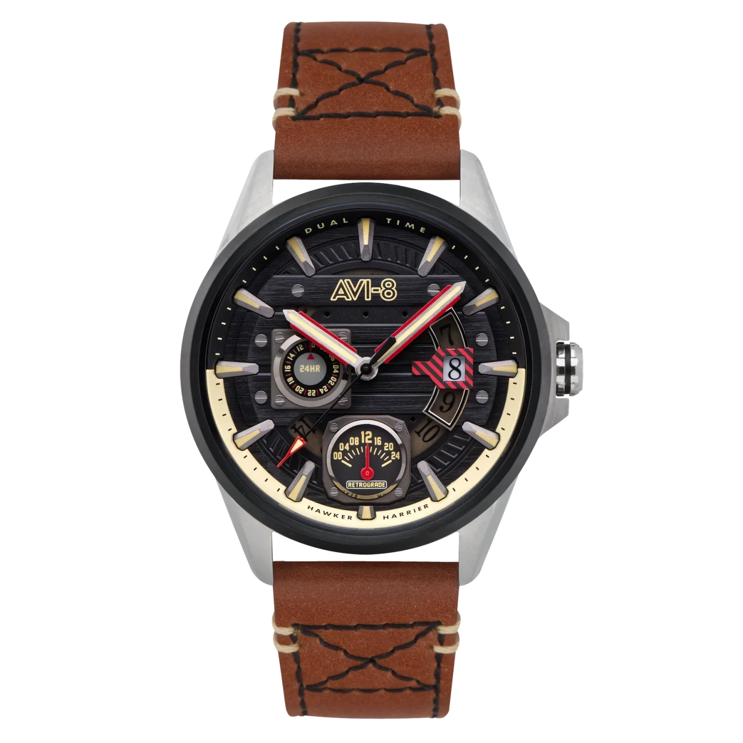Named in honour of renowned Hawker Harrier pilot John Farley, the AVI-8 AV-4098-02 channels the dynamic functionality of jet cockpit instruments into a bold, wearable form. Its aviation-inspired layout, complete with dual time retrograde display and 24-hour readout, makes it ideal for travellers and adventure seekers alike.
