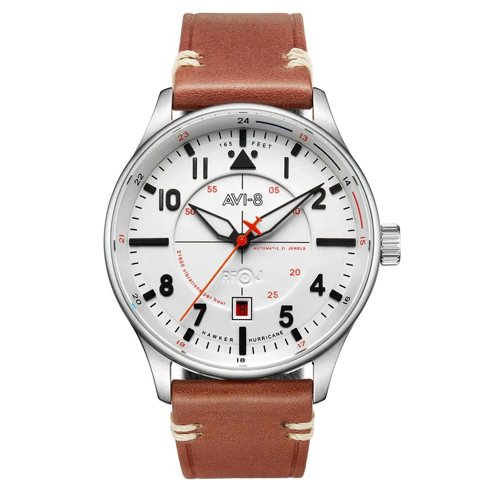 Honouring the RAF’s iconic 303 Squadron, the AVI-8 Kent Automatic is a rugged tribute to wartime precision and courage. The 43mm stainless steel case is matched with a clean white dial and luminous applied markers under a sapphire-coated crystal.