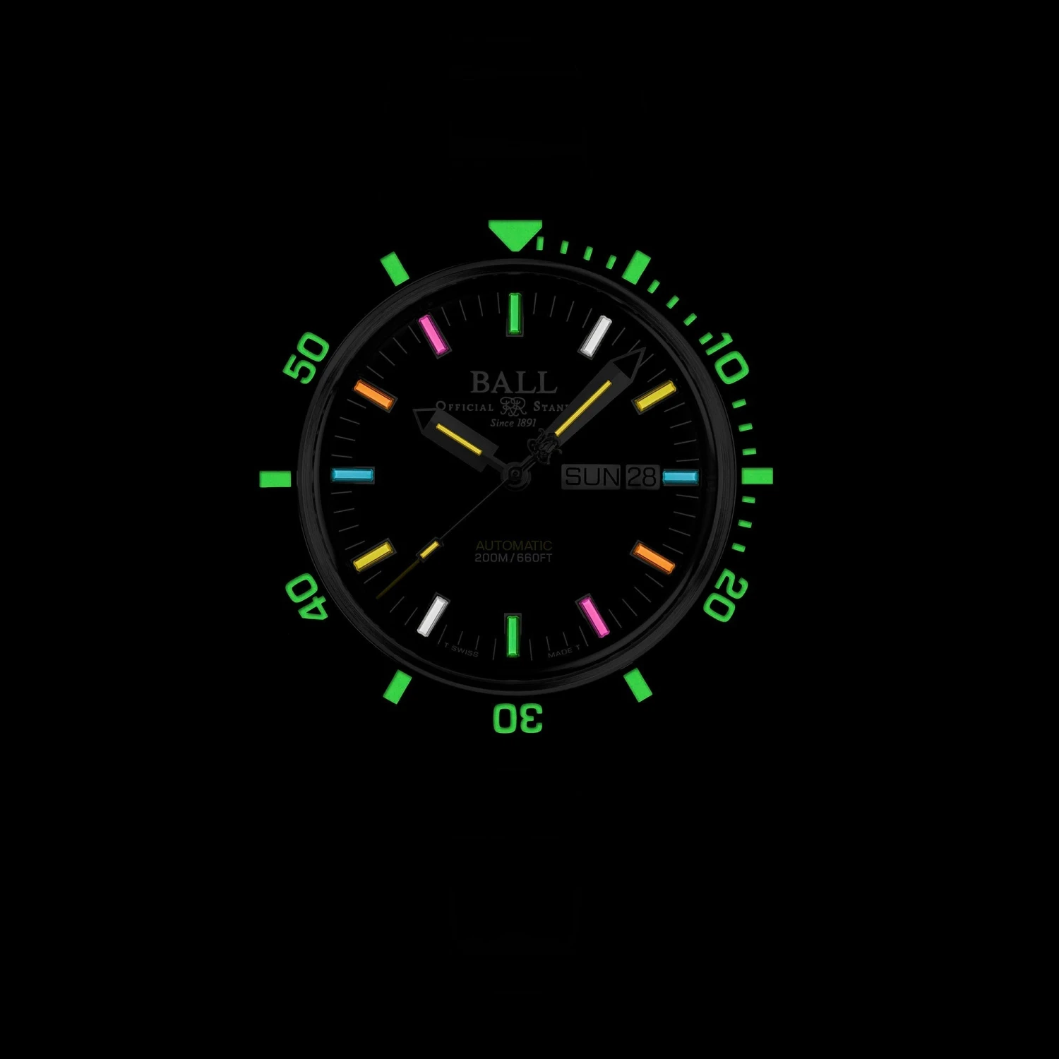 - Unidirectional rotating dome-shaped sapphire diving bezel with micro gas tubes illumination