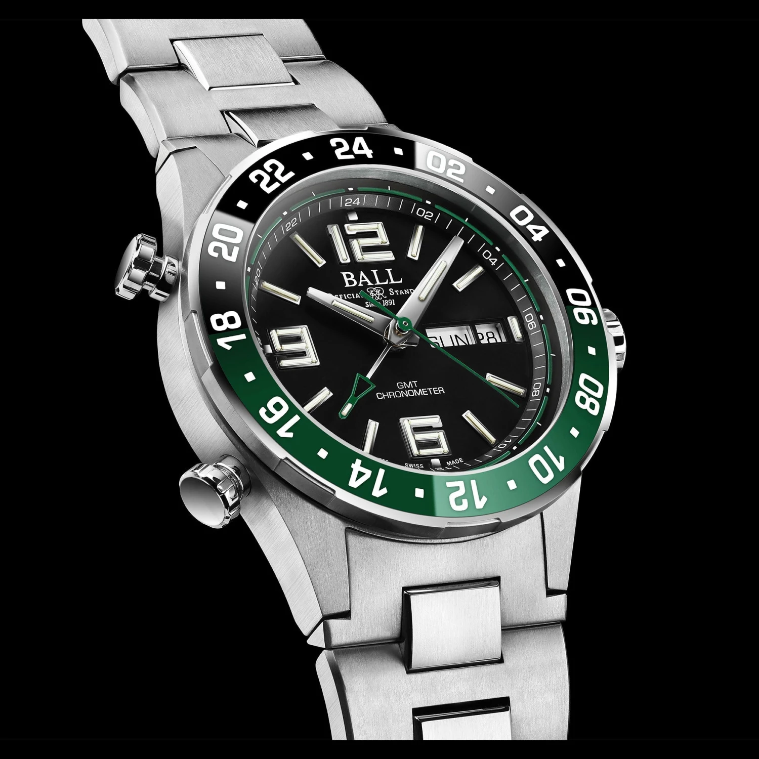 - 28 micro gas tubes on hour, minute and GMT hands and dial for night reading capability