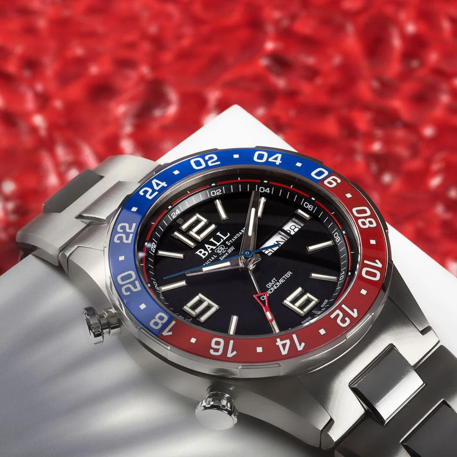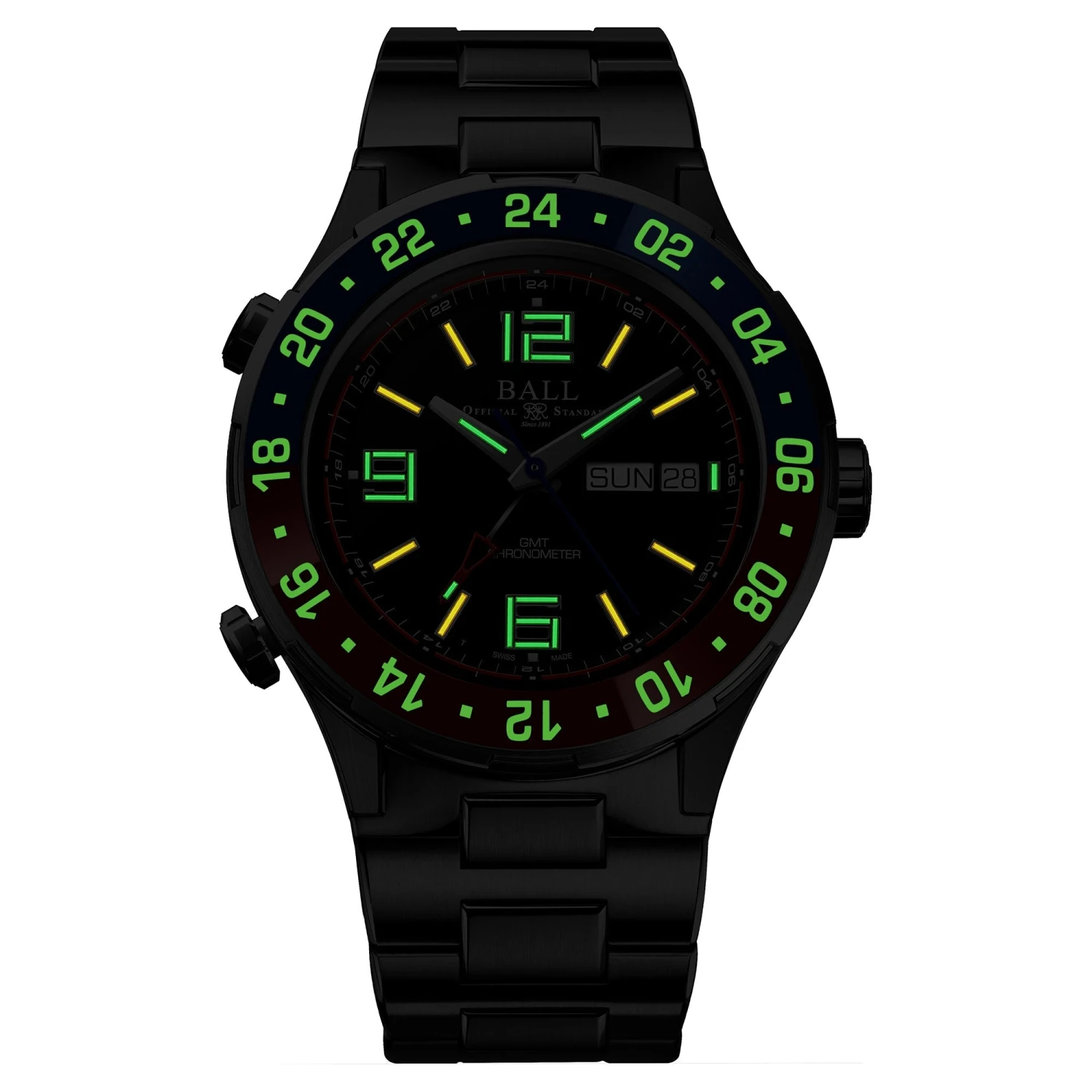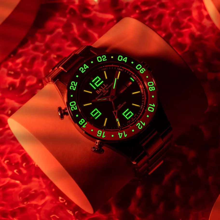 - 28 micro gas tubes on hour, minute and GMT hands and dial for night reading capability