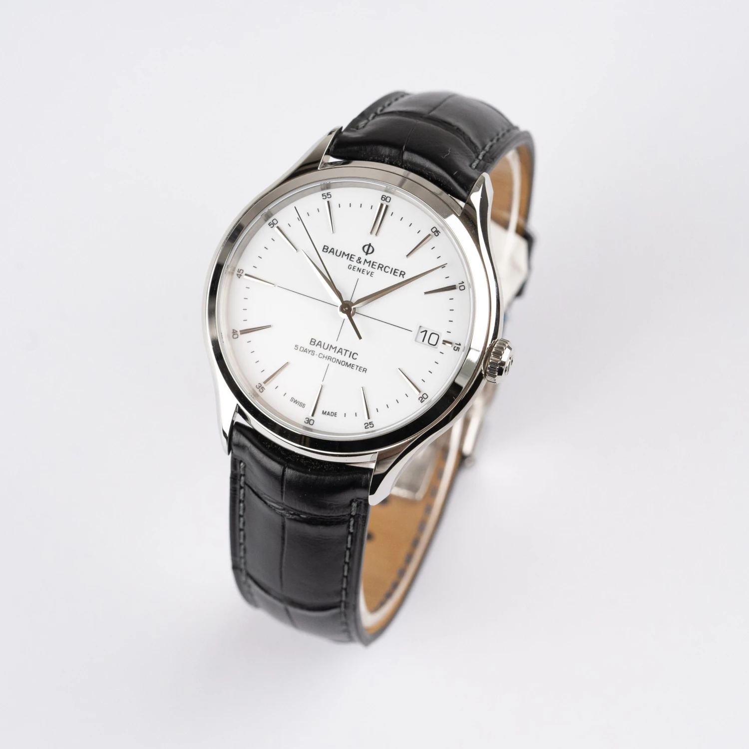 A sophisticated gentleman’s wristwatch, the Clifton Baumatic 10518 is an automatic date watch for men, manufactured with a manufactured self-winding caliber. Its balanced aesthetic pairs a timeless black alligator strap with a white dial, featuring both hour and minute time markers and the iconic date aperture at 3 o’clock. The steel case is finished with a transparent sapphire case back, through which the COSC automatic movement can be observed.