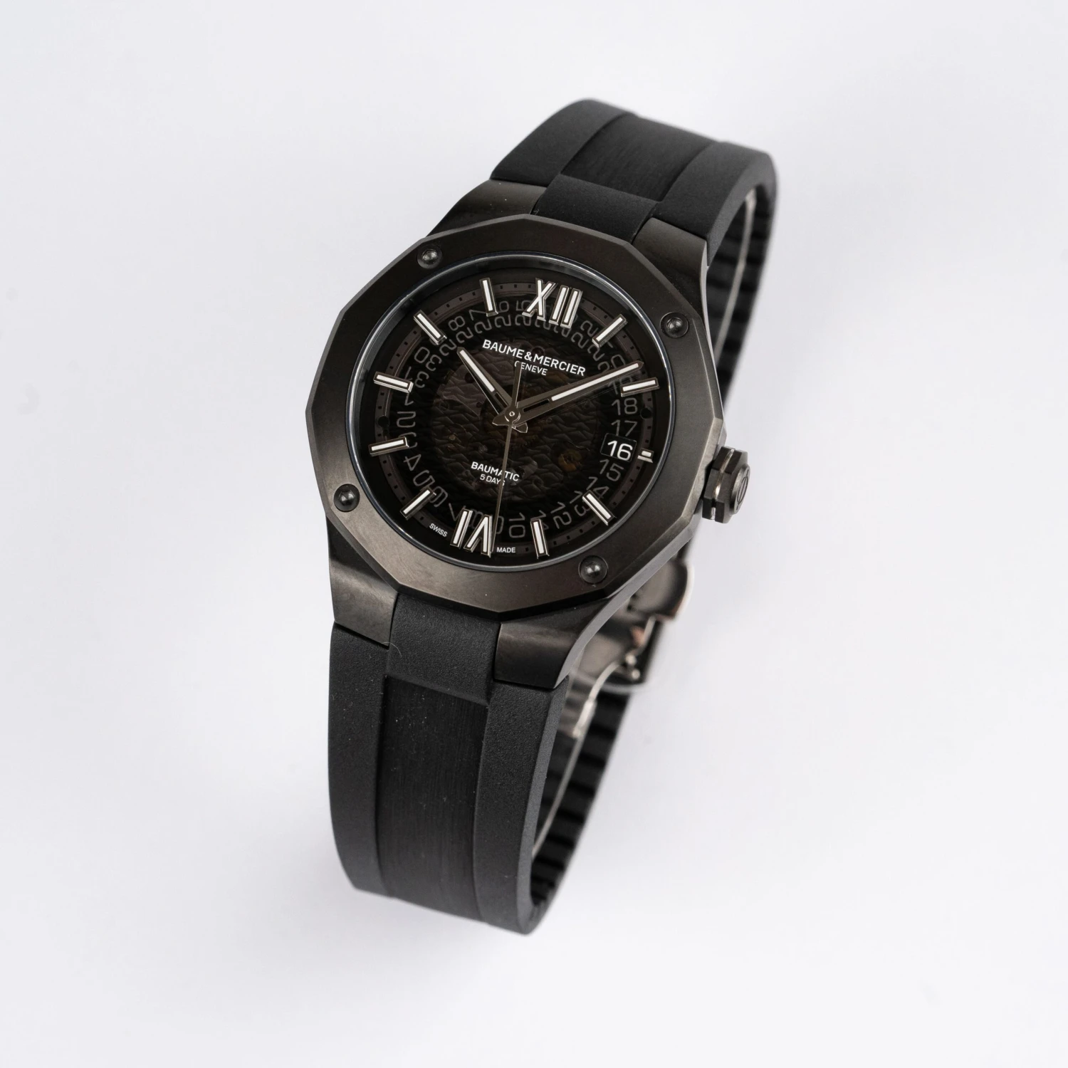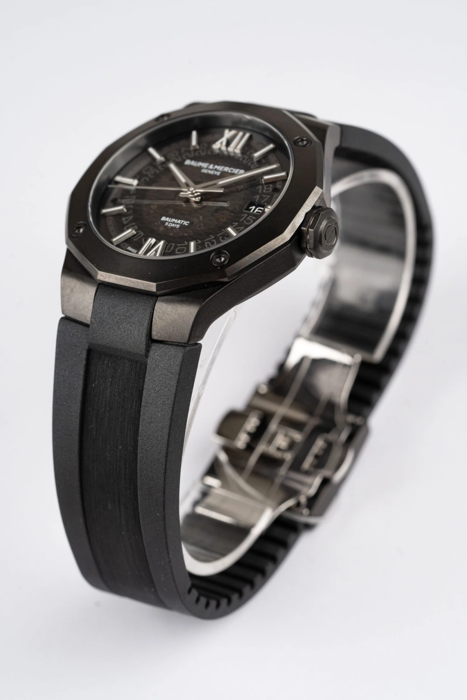 Driven by the prestigious Baumatic manufacture calibre, the Riviera 10617 is the subtle combination of a refined and sporty look. Displaying a smoked sapphire gray dial and a black steel-ADLC dodecagonal case, this distinctive silhouette is finished with a black rubber strap for an ultimate black look. Created in 1973, the Riviera watch returns this year to revive the spirit of a distinguished watchmaking era. Here it is in 2021, still authentic: a poised-sized steel case, a dodecagonal bezel equipped with four screws, a “Swiss Made” self-winding movement, and a built-in interchangeable rubber strap. The original design is still there, but so is the desire to adapt to our times.