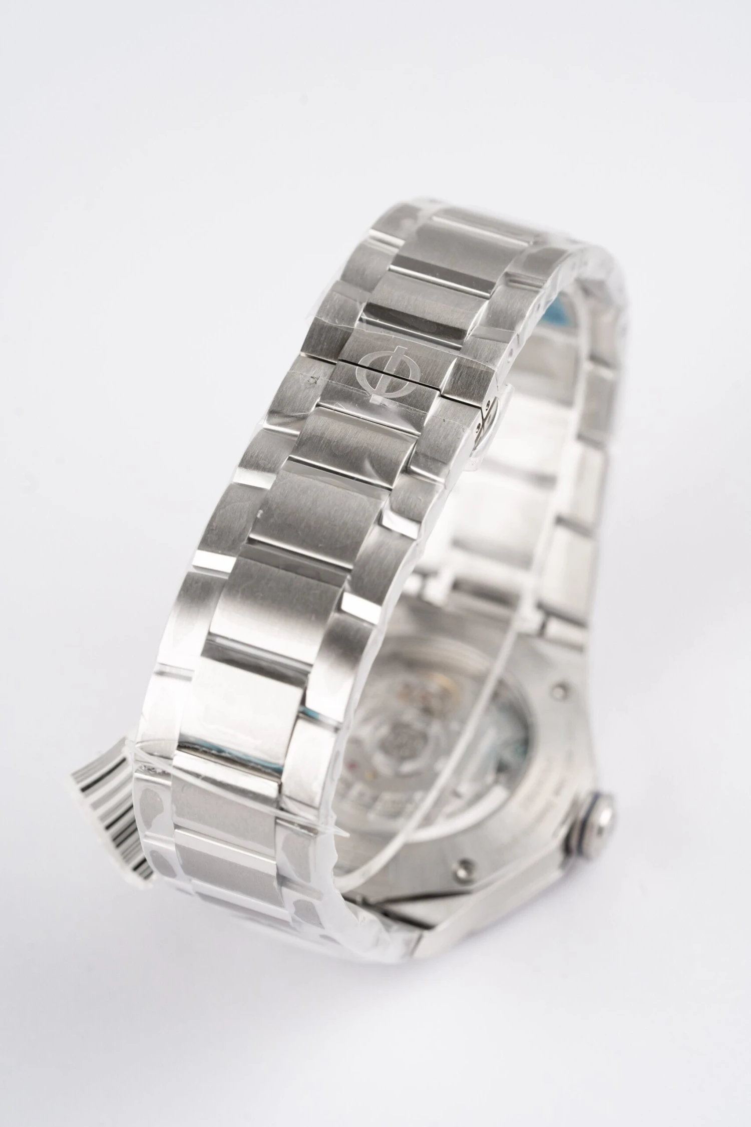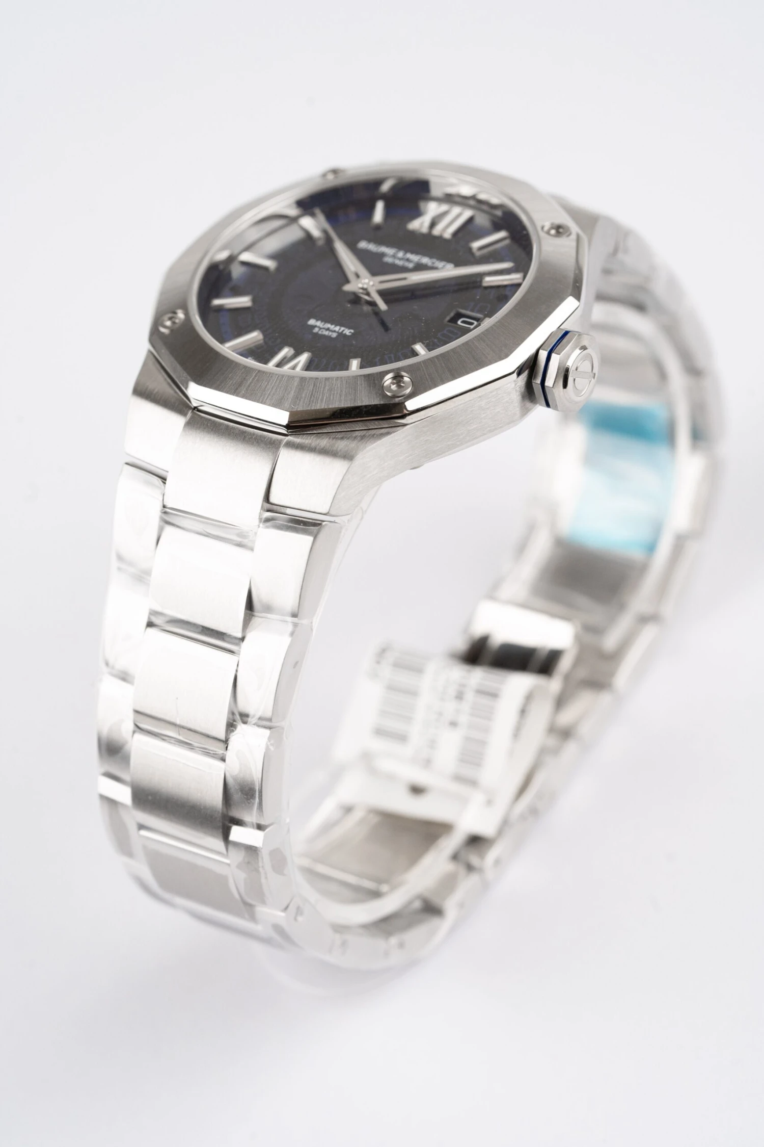 Driven by the prestigious Baumatic manufacture calibre, the Riviera 10616 is the all-road Swiss watch by excellence. Its transparent sapphire blue dial, its interchangeable metal bracelet and open caseback complete the sporty look of this “Swiss-Made” timepiece. Created in 1973, the Riviera watch returns this year to revive the spirit of a distinguished watchmaking era. Here it is in 2021, still authentic: a poised sized steel case, a dodecagonal bezel equipped with four screws, a “Swiss Made” self-winding calibre and a built-in interchangeable steel bracelet. The original design is still there, but so is the desire to adapt to our times.
