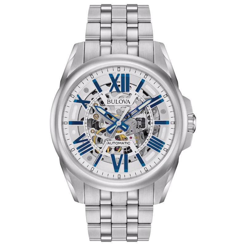 From the Classic Automatic Collection, the Sutton showcases timeless elegance and mechanical precision. Encased in stainless steel, it features a captivating silver and blue skeleton dial and an exhibition case back that reveals its self-winding movement. The watch is protected by flat mineral glass for durability and is complemented by a stainless steel bracelet with a double-press deployment closure, ensuring a secure and stylish fit.