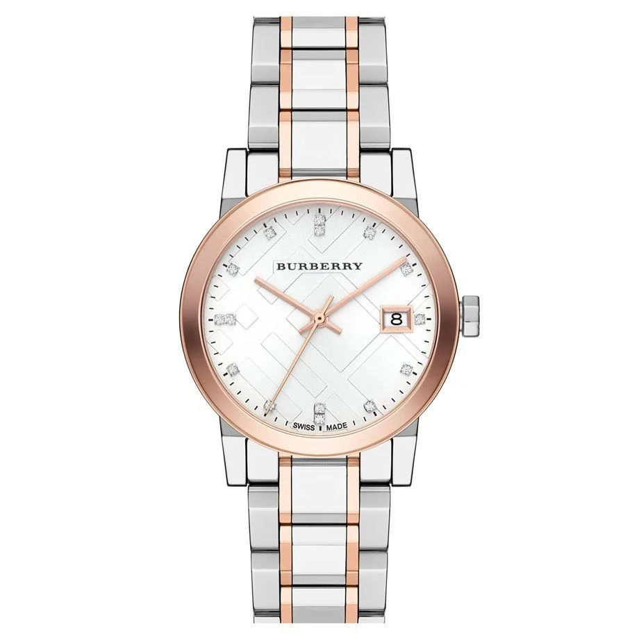 Silver Textured Dial. Rose Gold PVD Plated Stainless Steel Hands and Diamond Indexes. Date Window at 3.