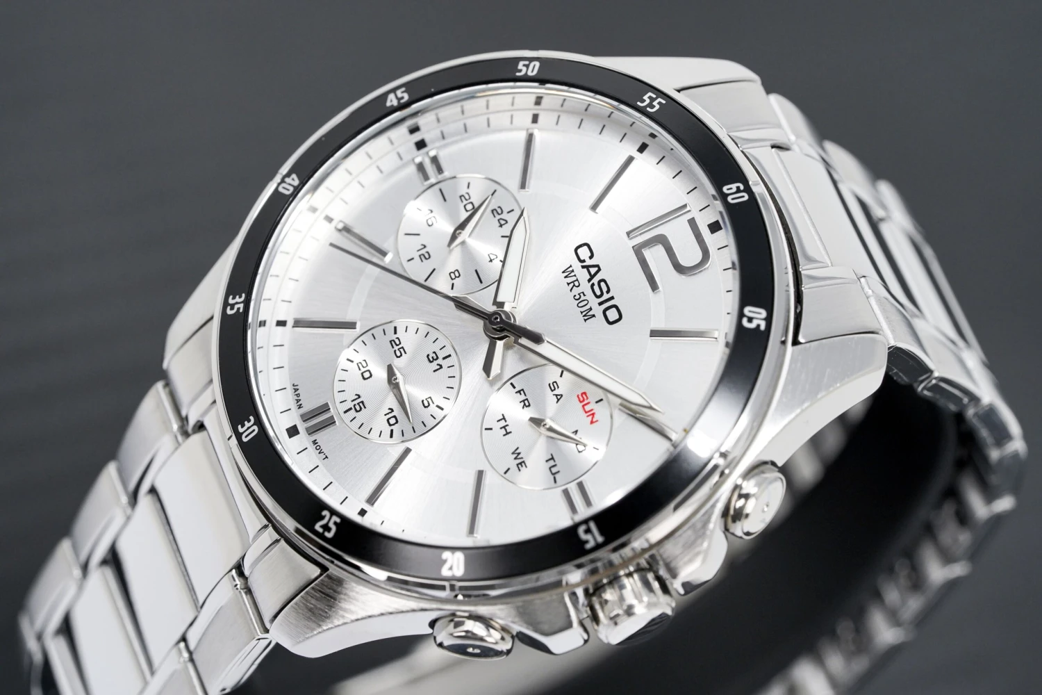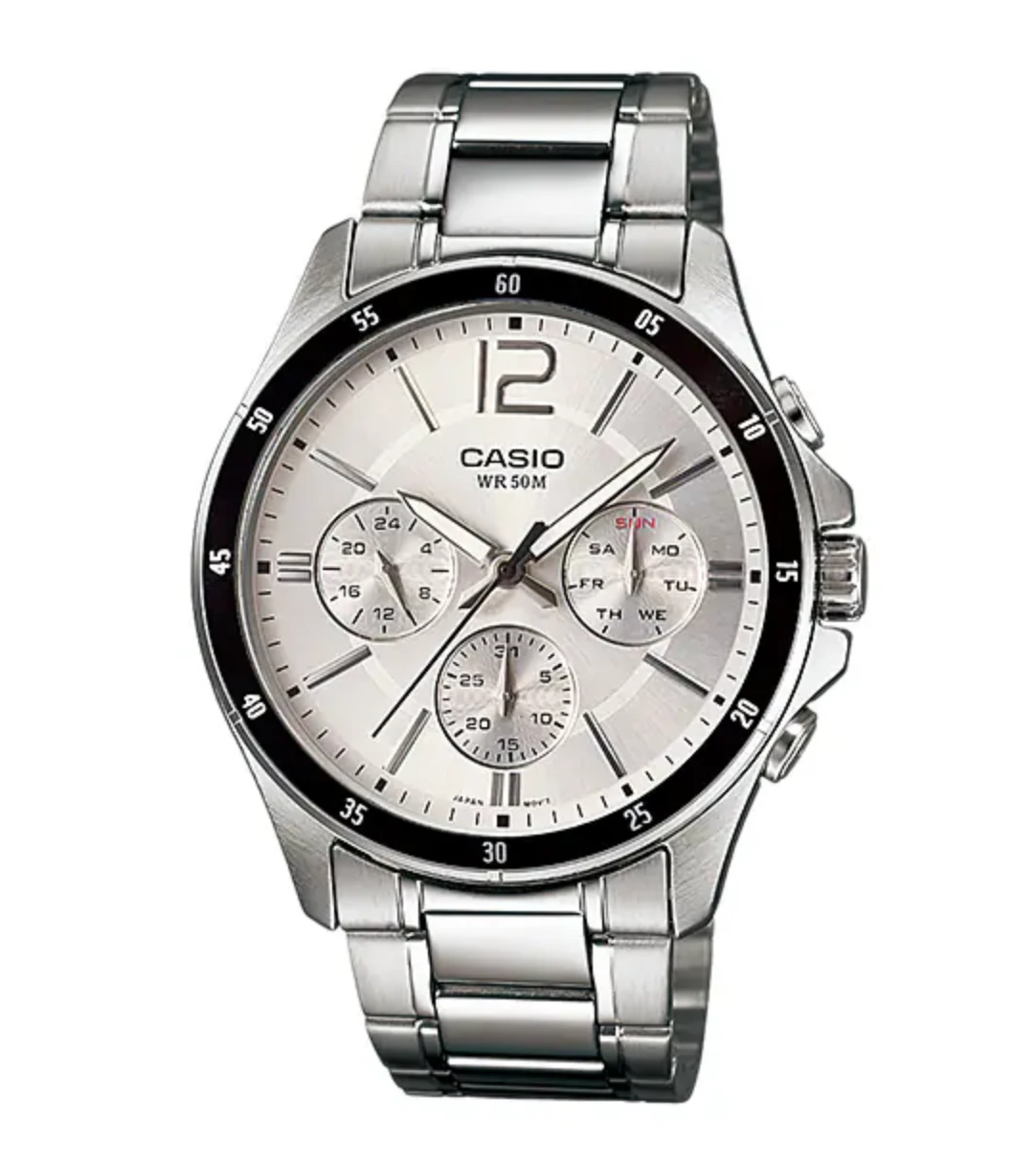The Casio Men’s Chronograph Stainless Steel Silver Watch MTP-1374D-7AVDF features a durable 47mm 316L stainless steel circular case with a silver stainless steel bracelet. The silver dial includes luminous hands, hour indexes, and sub-dials displaying day, date, and 24-hour time.