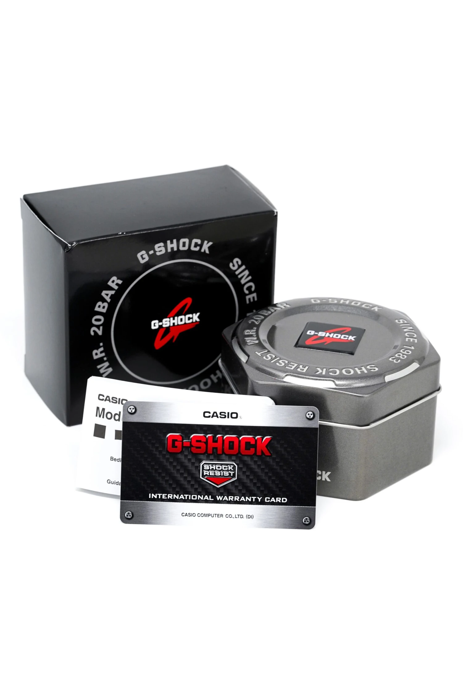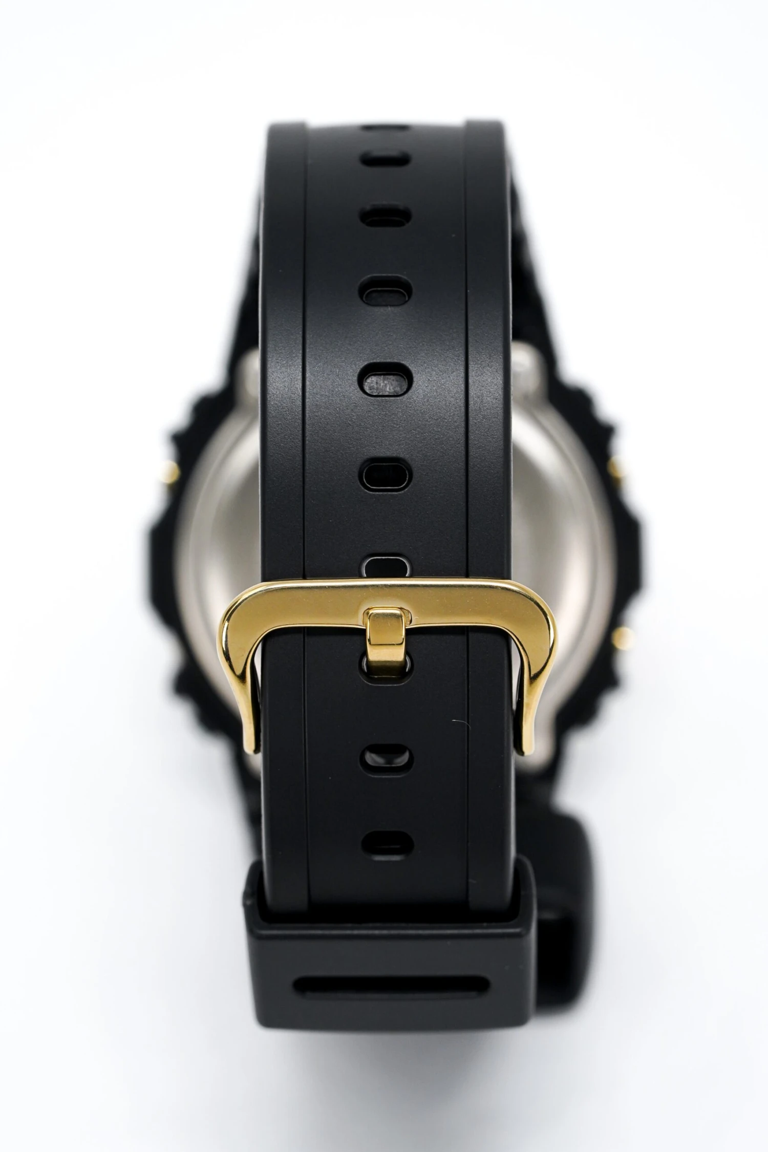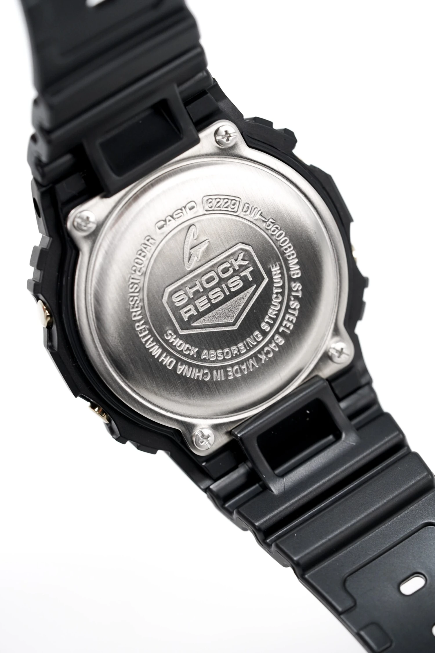 Japanese Quartz Movement. Stopwatch, Timer, Alarm, Flash Alert and Automatic Calendar Functions.48.9mm x 42.8mm x 13.4mm Black Resin and Stainless Steel Square Case. Characteristic Shock-Proof Case with Easy to Press Button ArrangementMetallic Gold Mirror Face Digital Dial with Scratch Resistant Mineral Crystal.27mm Black Resin Strap with Stainless Steel Pin BuckleWater Resistant to 200 Metres 20ATM