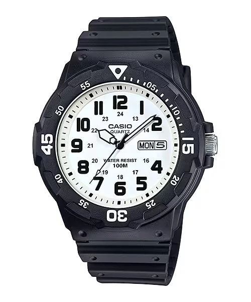 The Casio MRW-200H-7BV Men’s Watch is a stylish and functional timepiece designed for everyday wear. Featuring a black resin case and a contrasting white dial, this watch delivers a sporty and modern aesthetic.