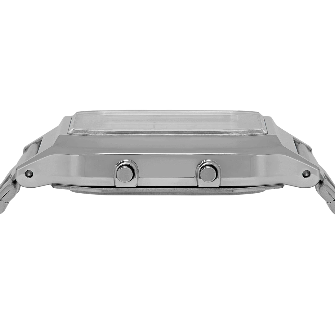 A stylish classic Casio design, part of the Vintage collection, this timepiece features a digital and anologue display, dual time mode, a stopwatch and useful alarm. It is resistant to minor splashing and perfect for everyday wear. A silver coloured band completes the look.