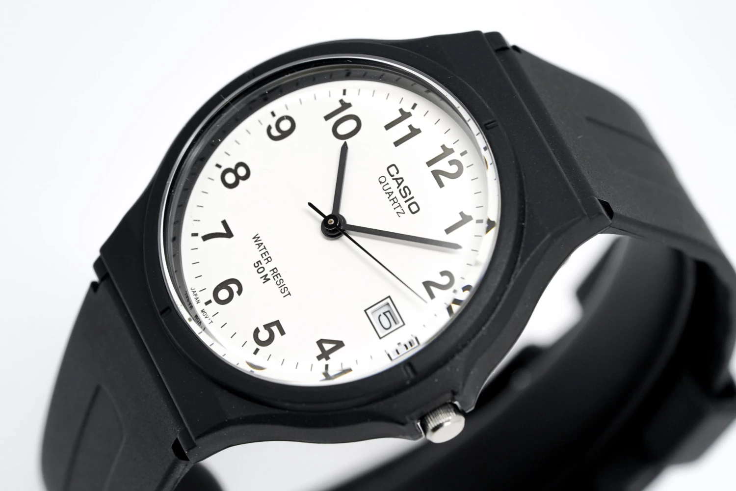 White Dial – Black Hands and Arabic Numeral Hour Indexes – Date Window at 3 O’Clock.