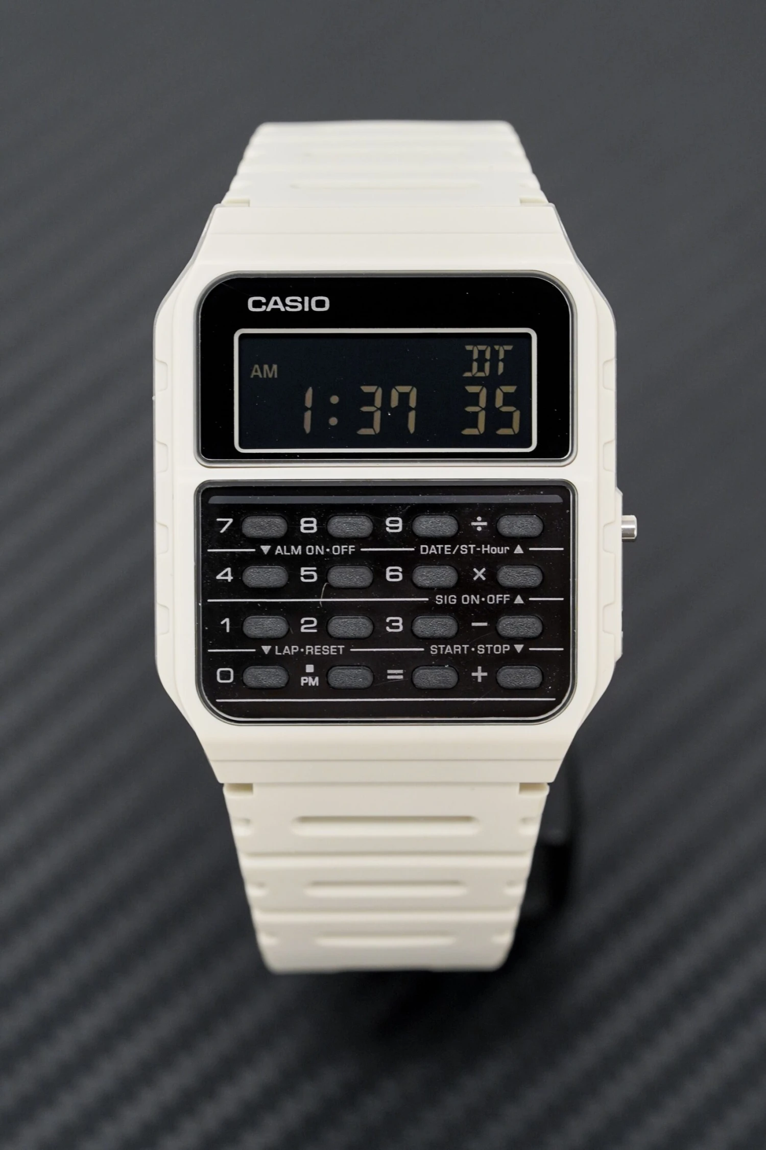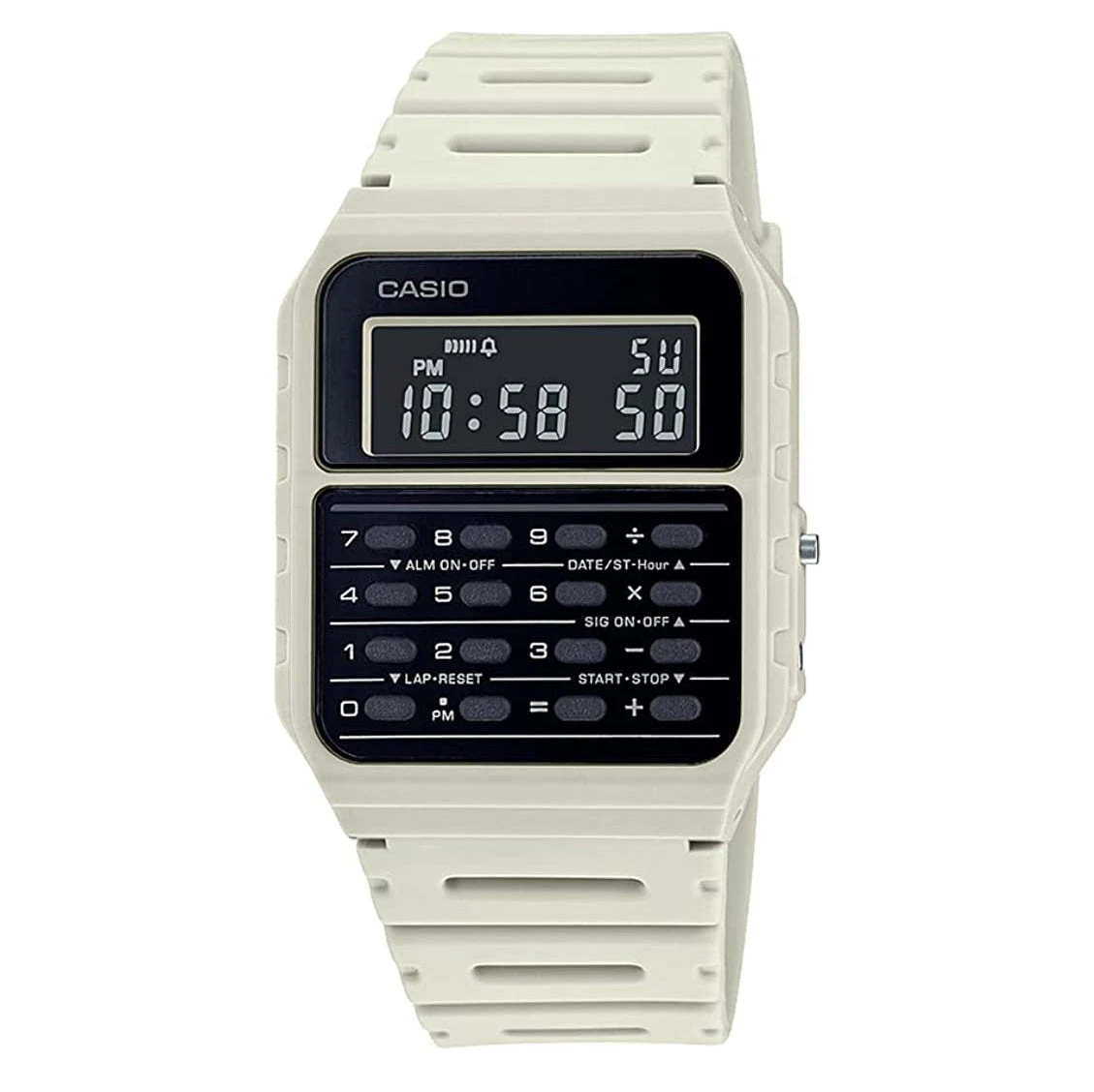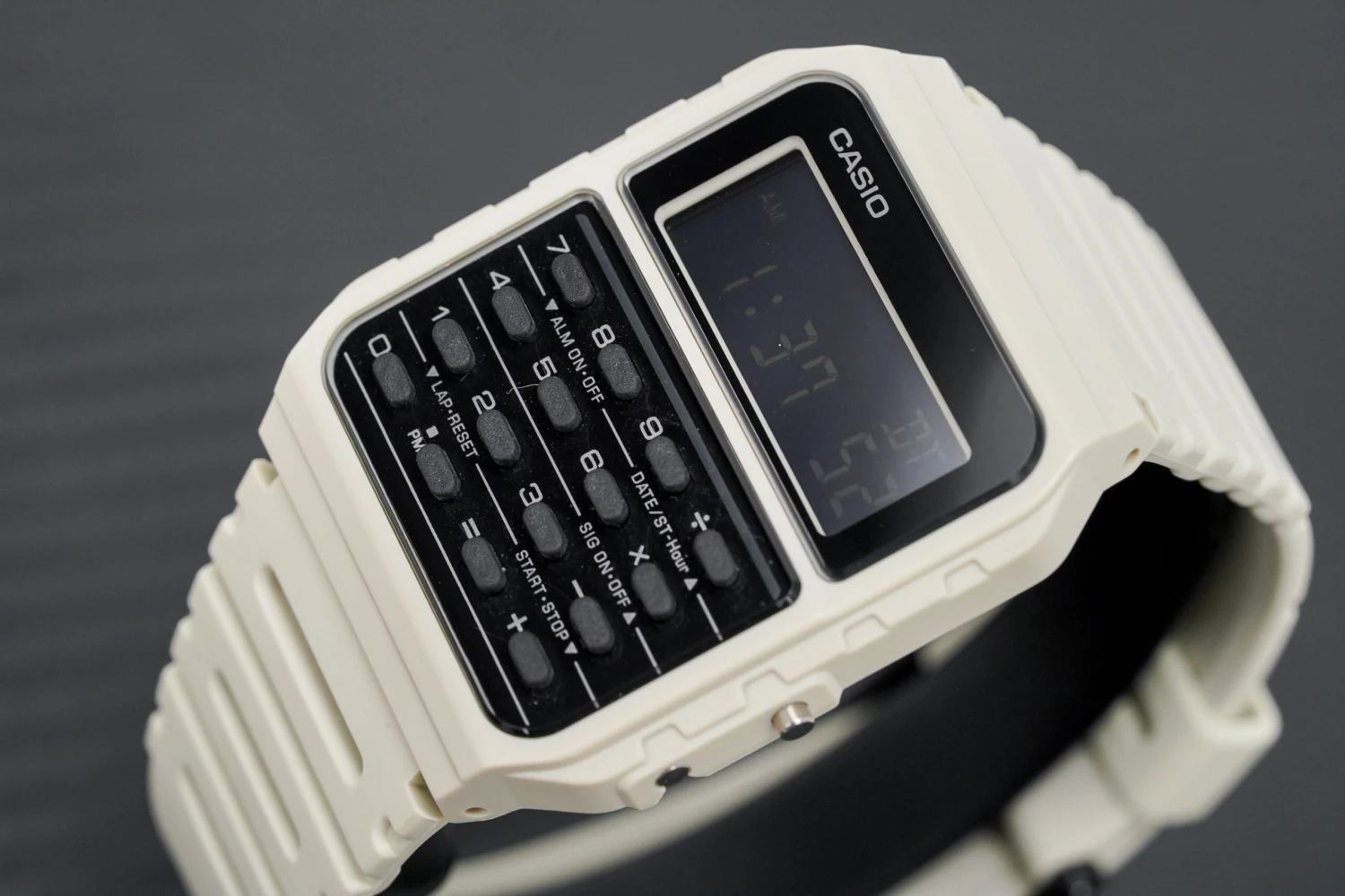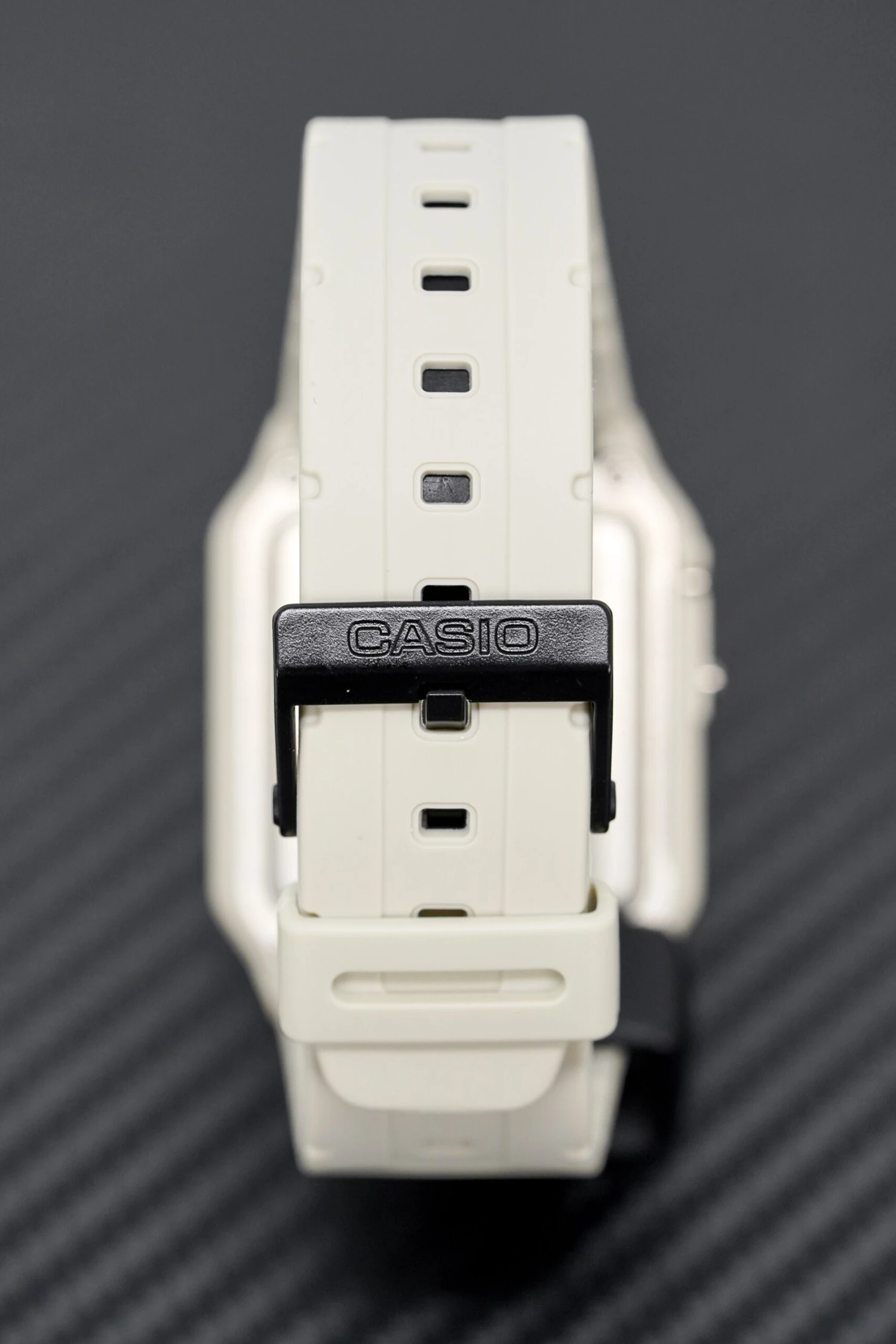 43.2mm x 34.4mm x 8.2mm White Resin Rectangular Case – Resin Glass – Solid Caseback – Easy to Press Button Arrangement.
