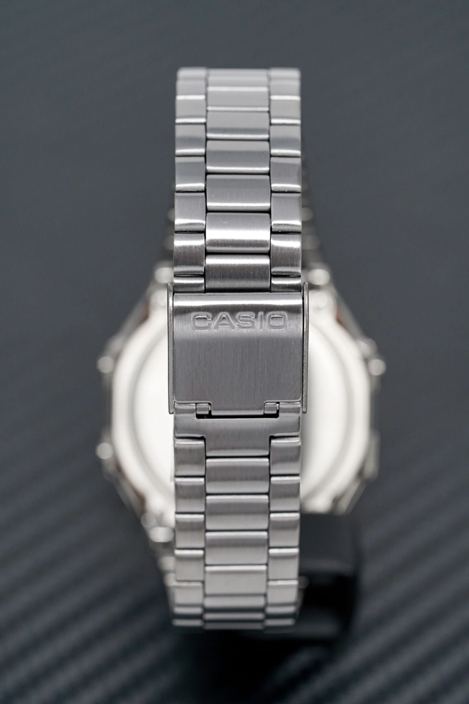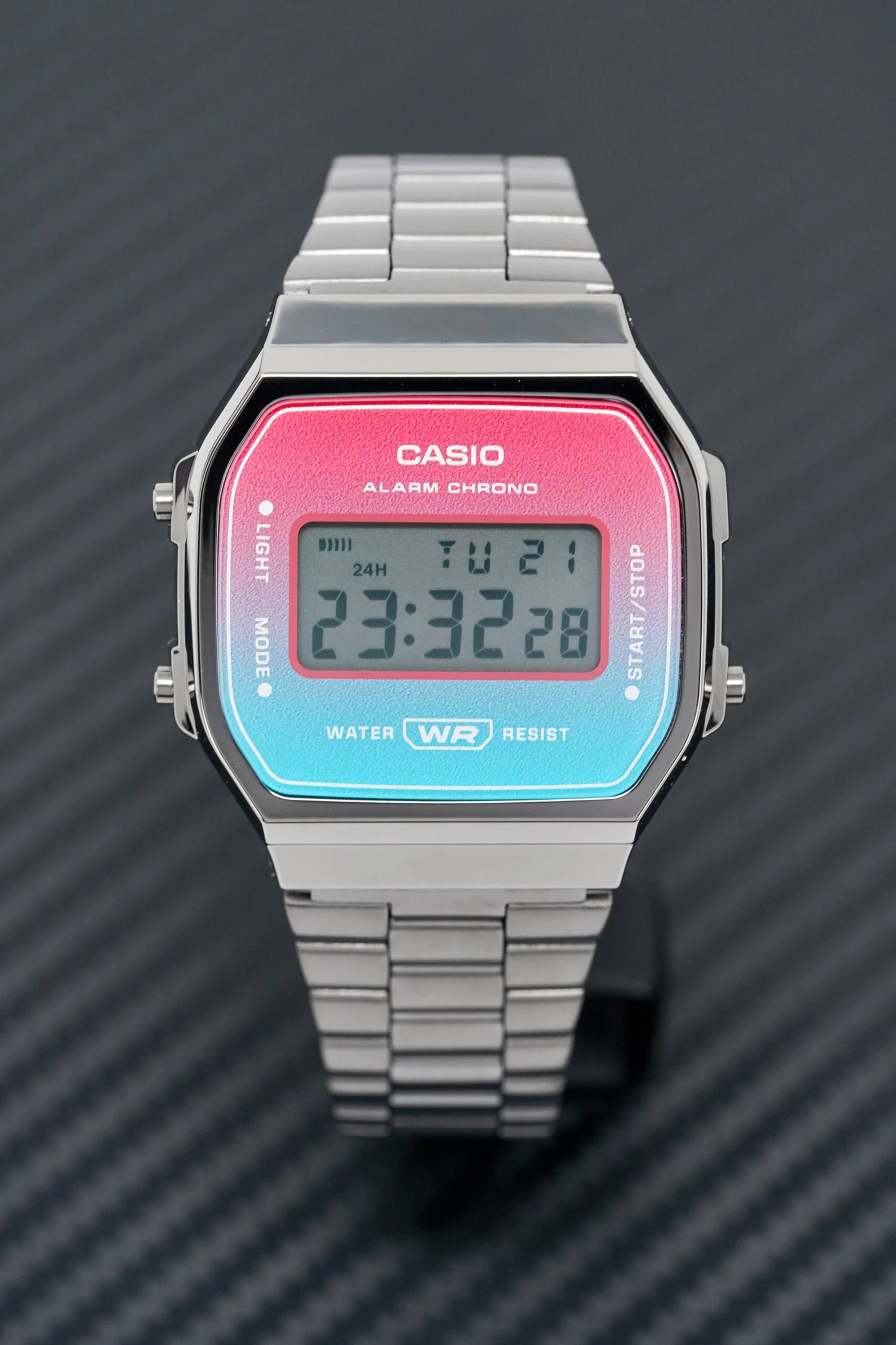 Quartz Movement – Digital Function – Day & Date – 1/100-second Stopwatch – Electro-luminescent Backlight – Daily Alarm Auto Calendar – 12/24 Hour-Format – Approximate battery life of 7 years on CR2016. 38.6mm x 36.3mm 9.6mm Dark Grey Stainless Steel Square Case – Resin Glass – Easy to Press Button Arrangement. Ombré Pink/Blue Dial – Black Digital Font and Arabic Numbers. 20-14mm Dark Grey Stainless Steel Self Adjustable Strap with Push Button Deployment Clasp.Water Resistant to 50 Metres 5ATM Please press and hold the summary from the right side for a few seconds and the CASIO sign should come up