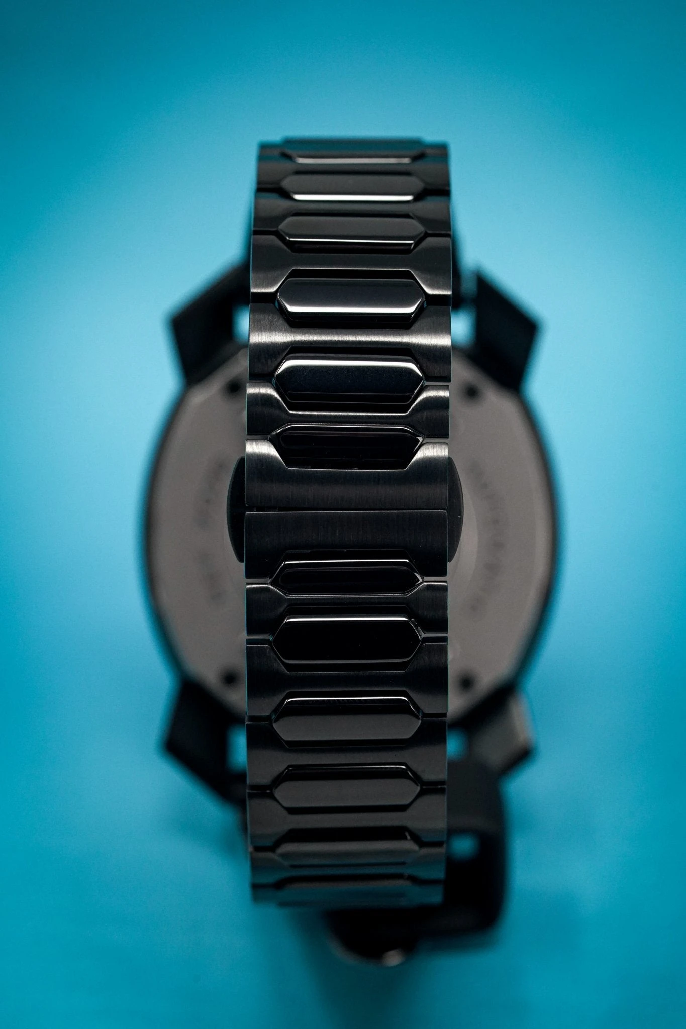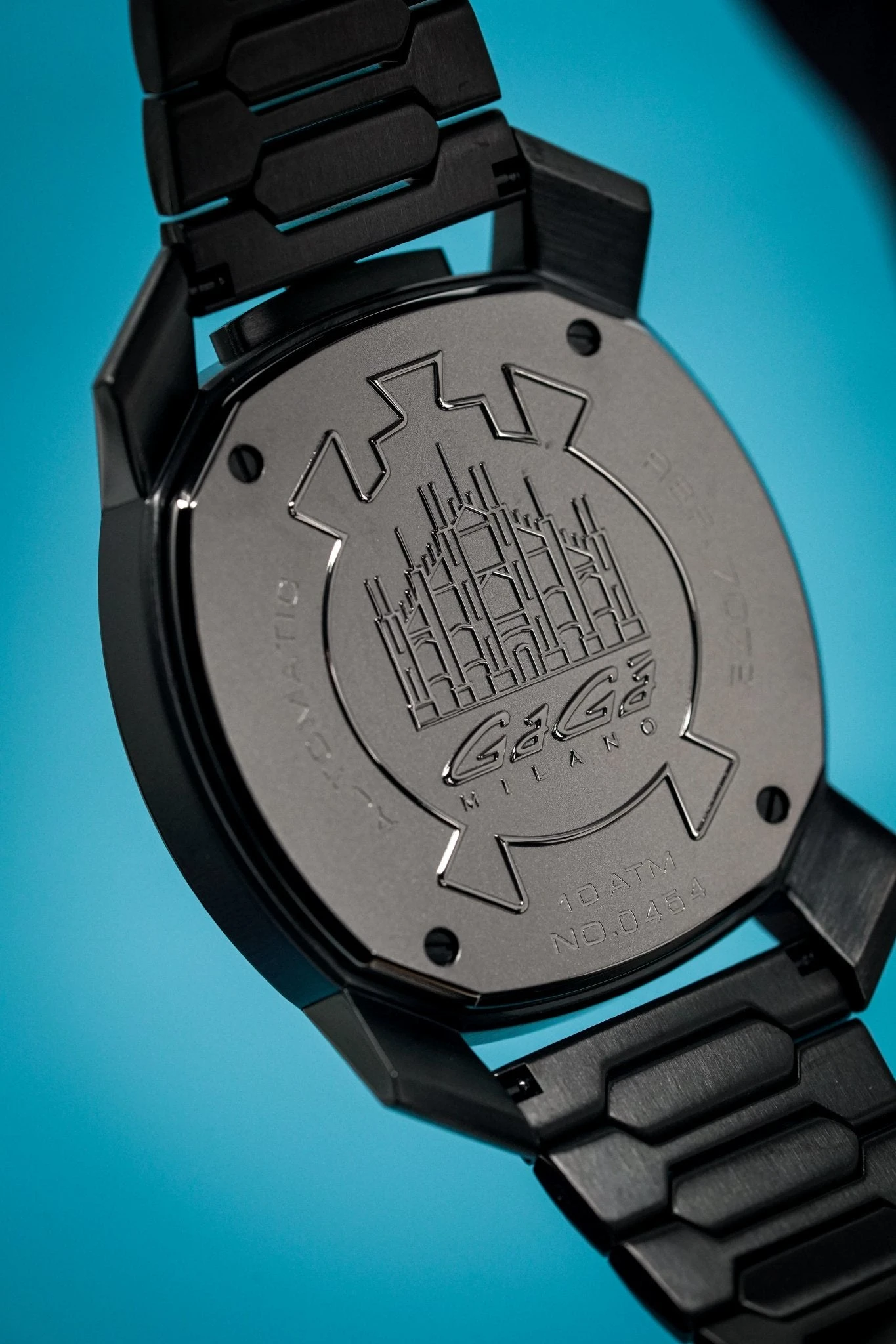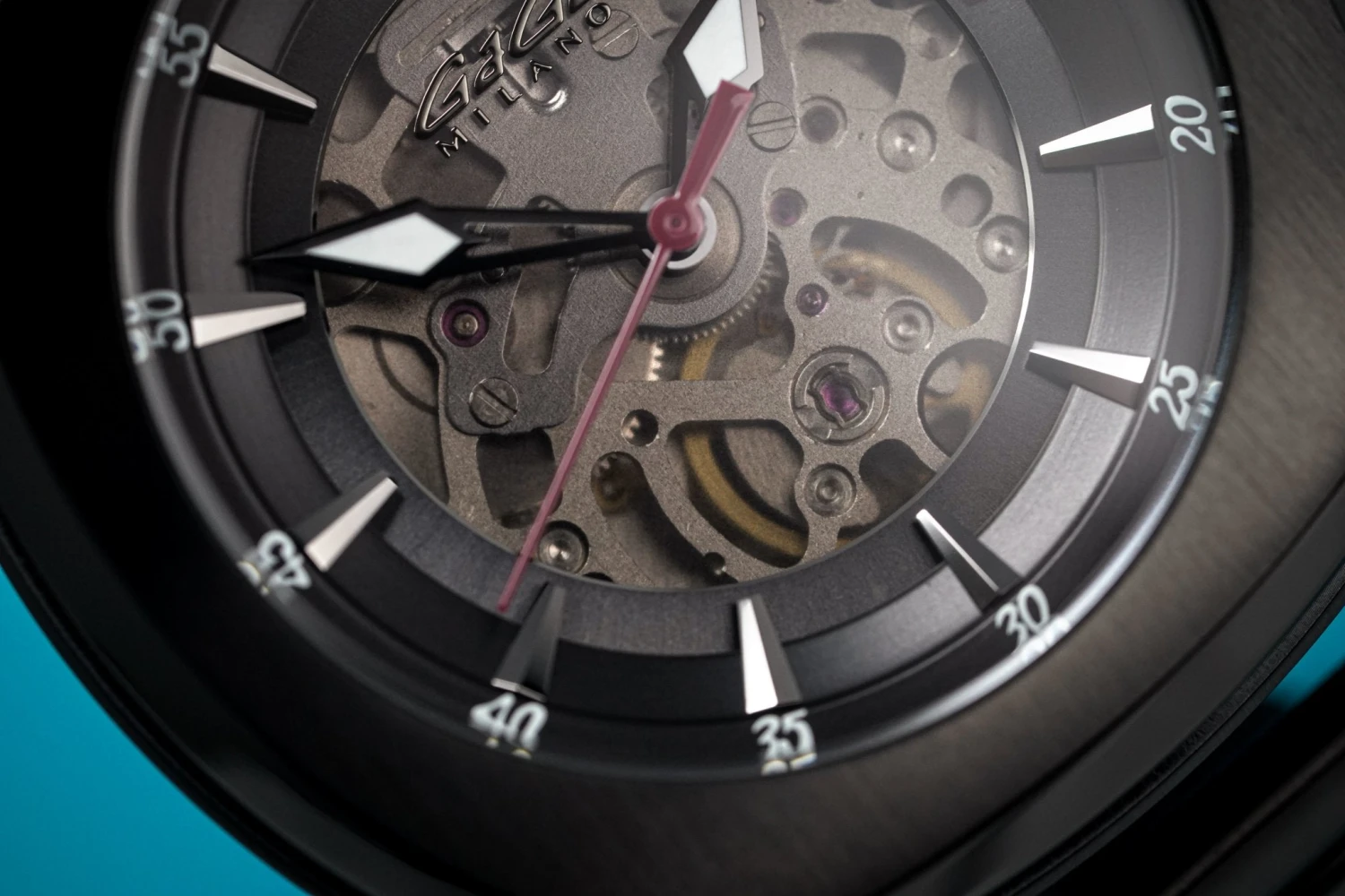 Skeleton Dial. Polished Black PVD Steel Hour Markers and Hands.