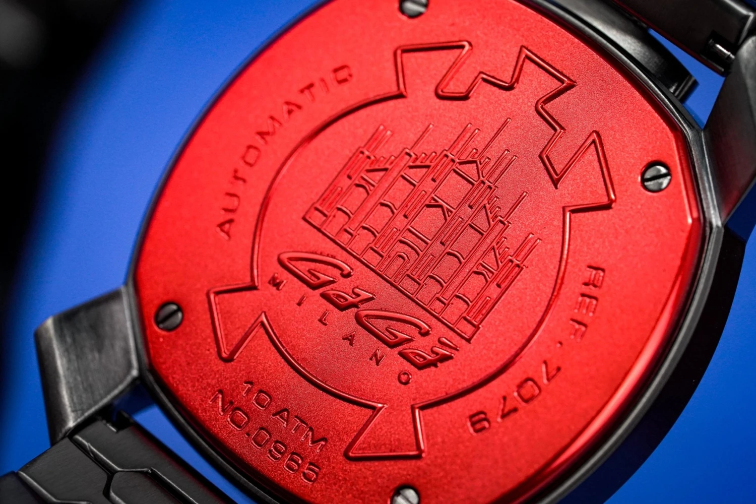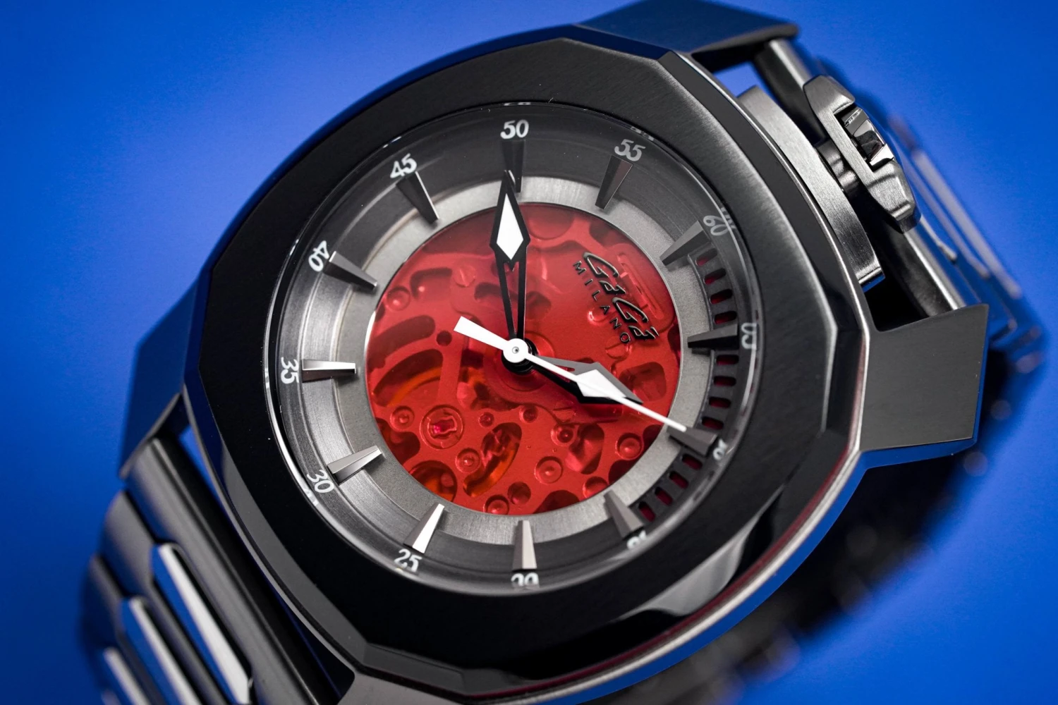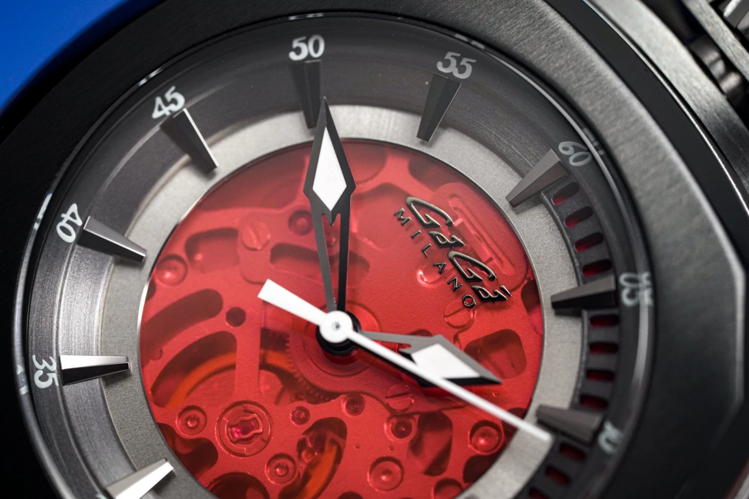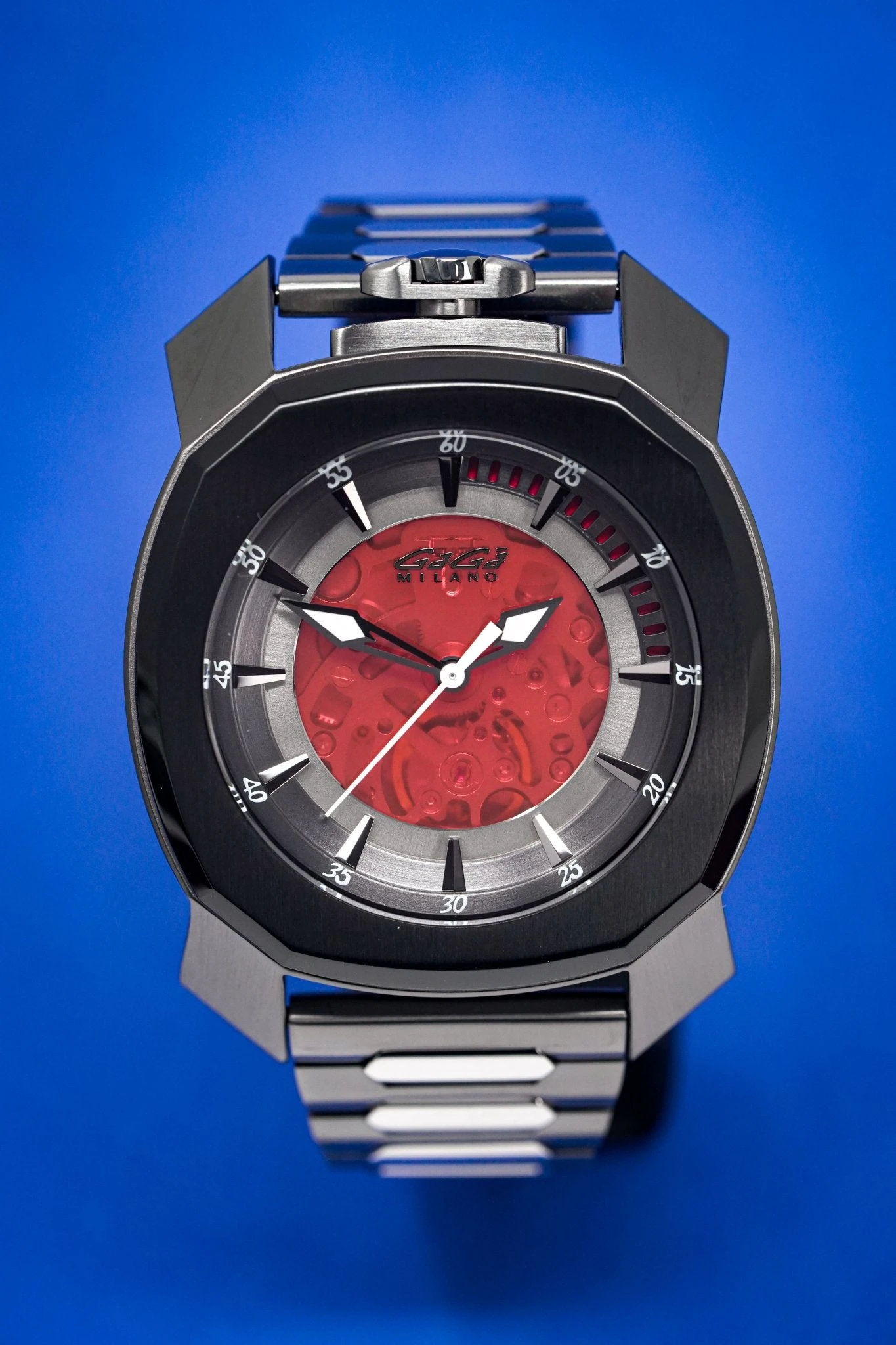 Red Skeleton Dial. Polished Steel Hour Markers and Hands.