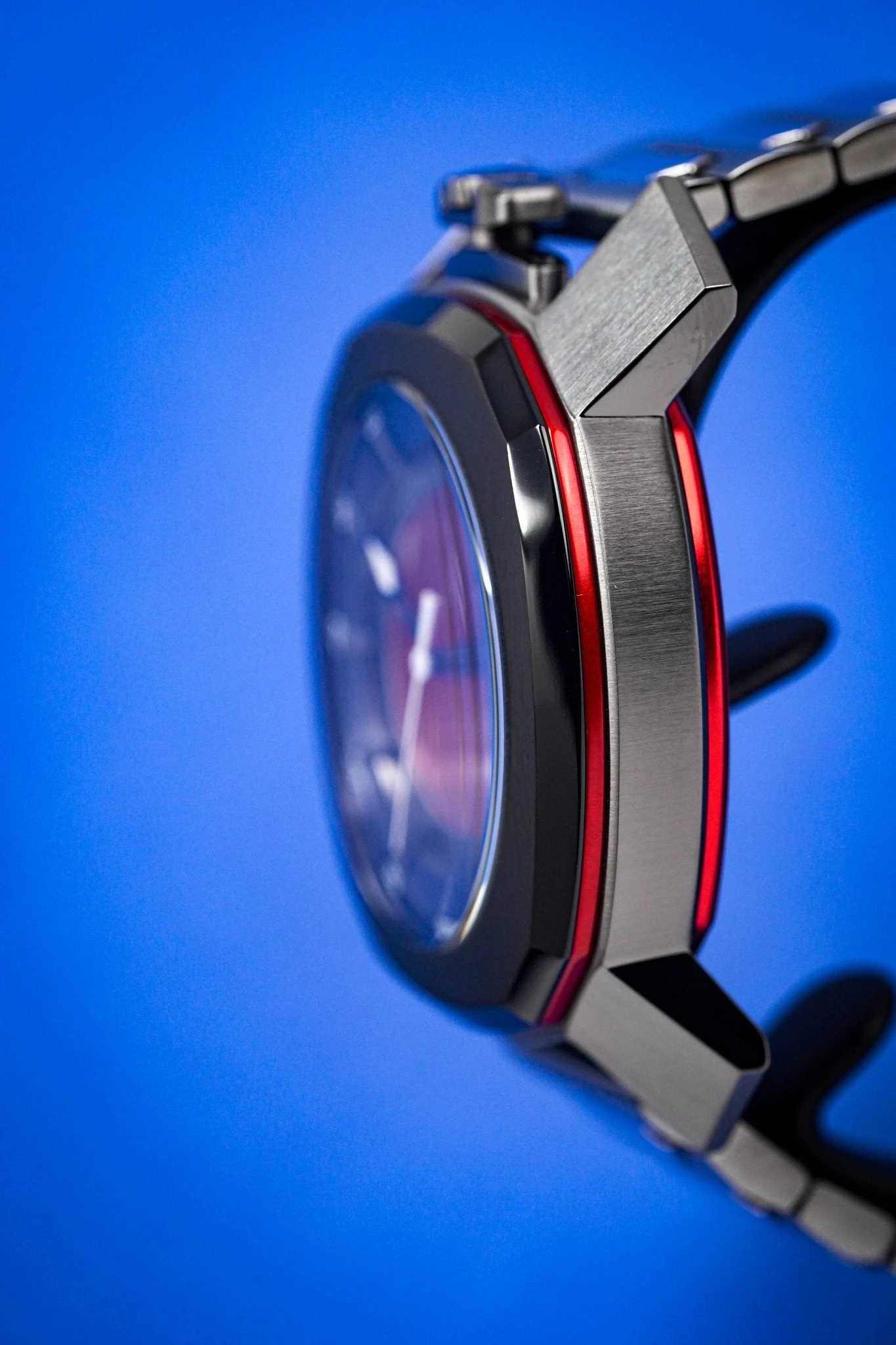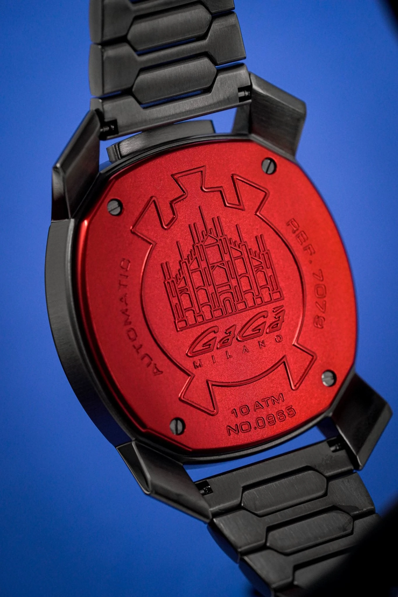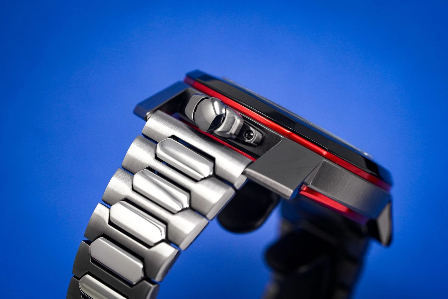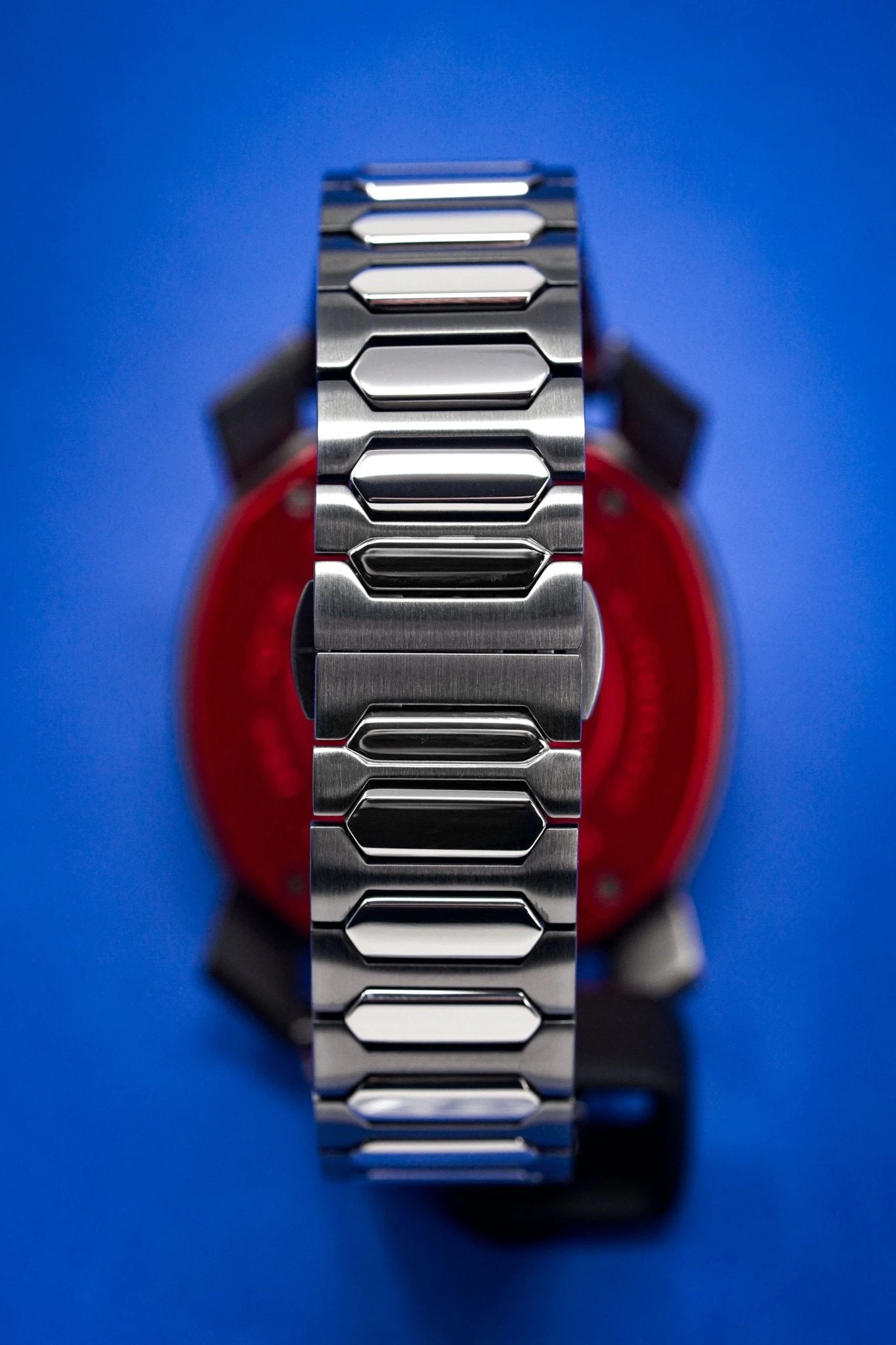 Red Skeleton Dial. Polished Steel Hour Markers and Hands.