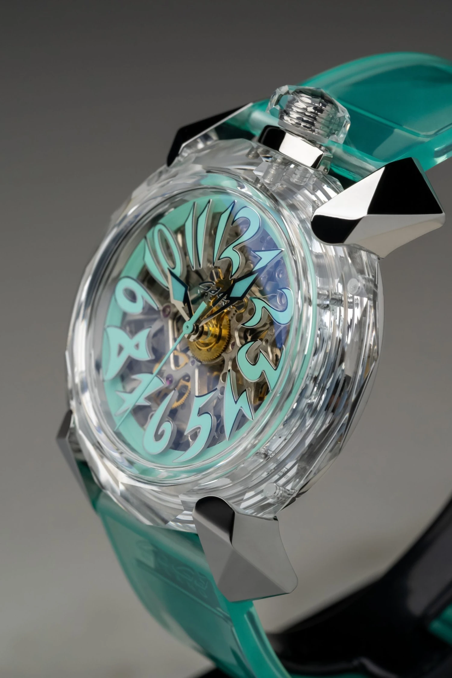 Dial: Transparent Skeleton Dial – Turquoise Arabic Hour Markers – Glass K9 Bezel Material.
