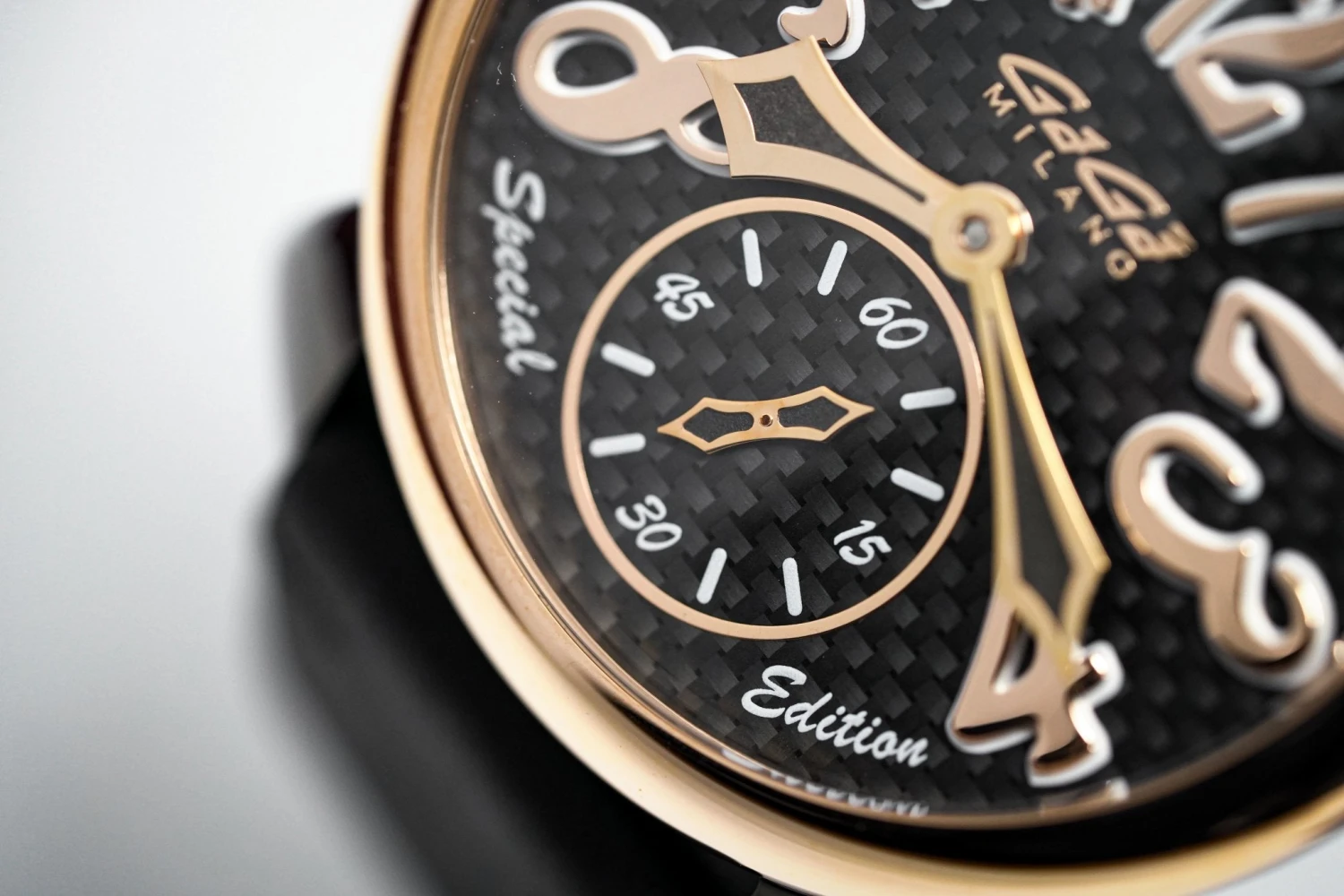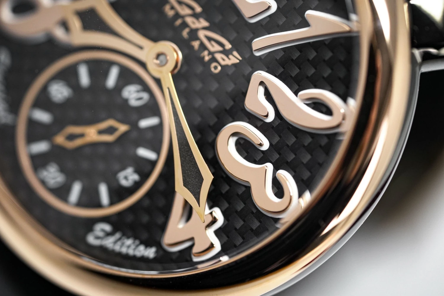 Black Carbon Fibre Dial with Rose Gold Plated Arabic Indexes – Rose Gold Plated 316L Stainless Steel Minute and Hour Hand – Small Seconds at 6 O’Clock