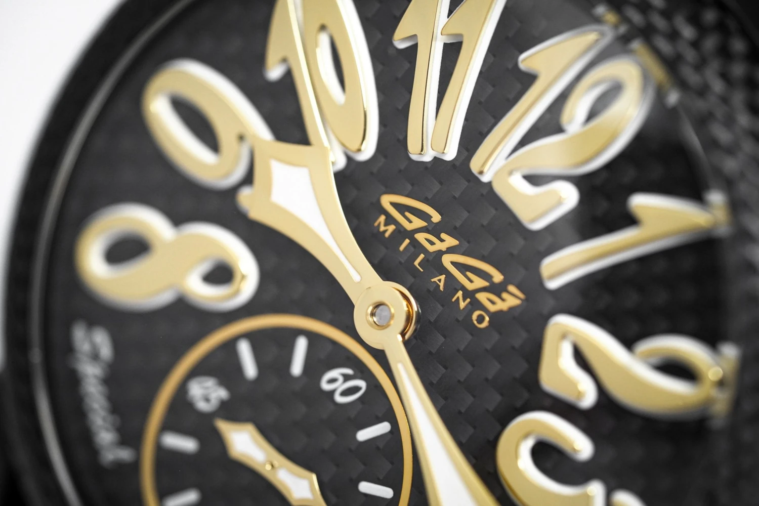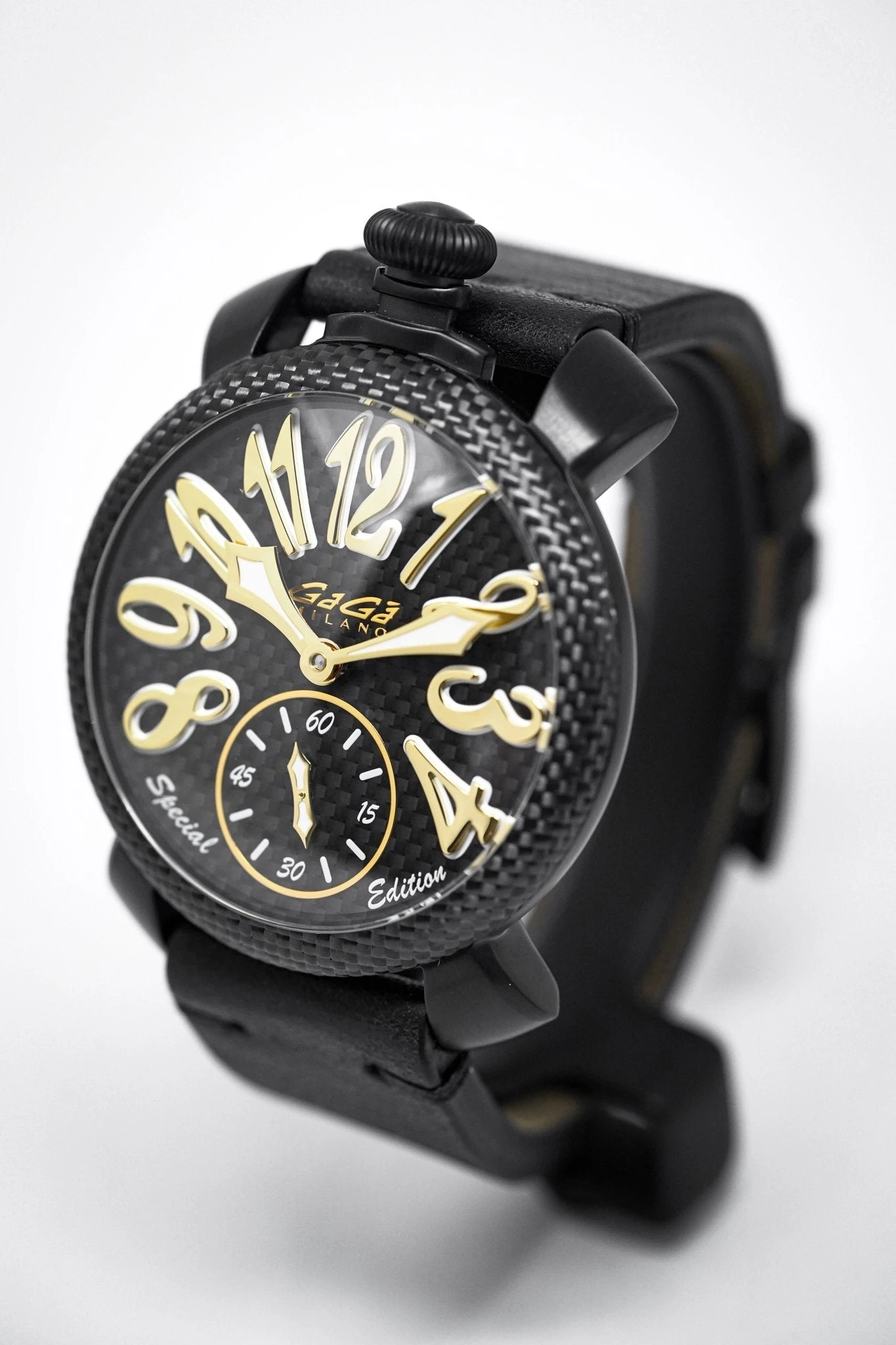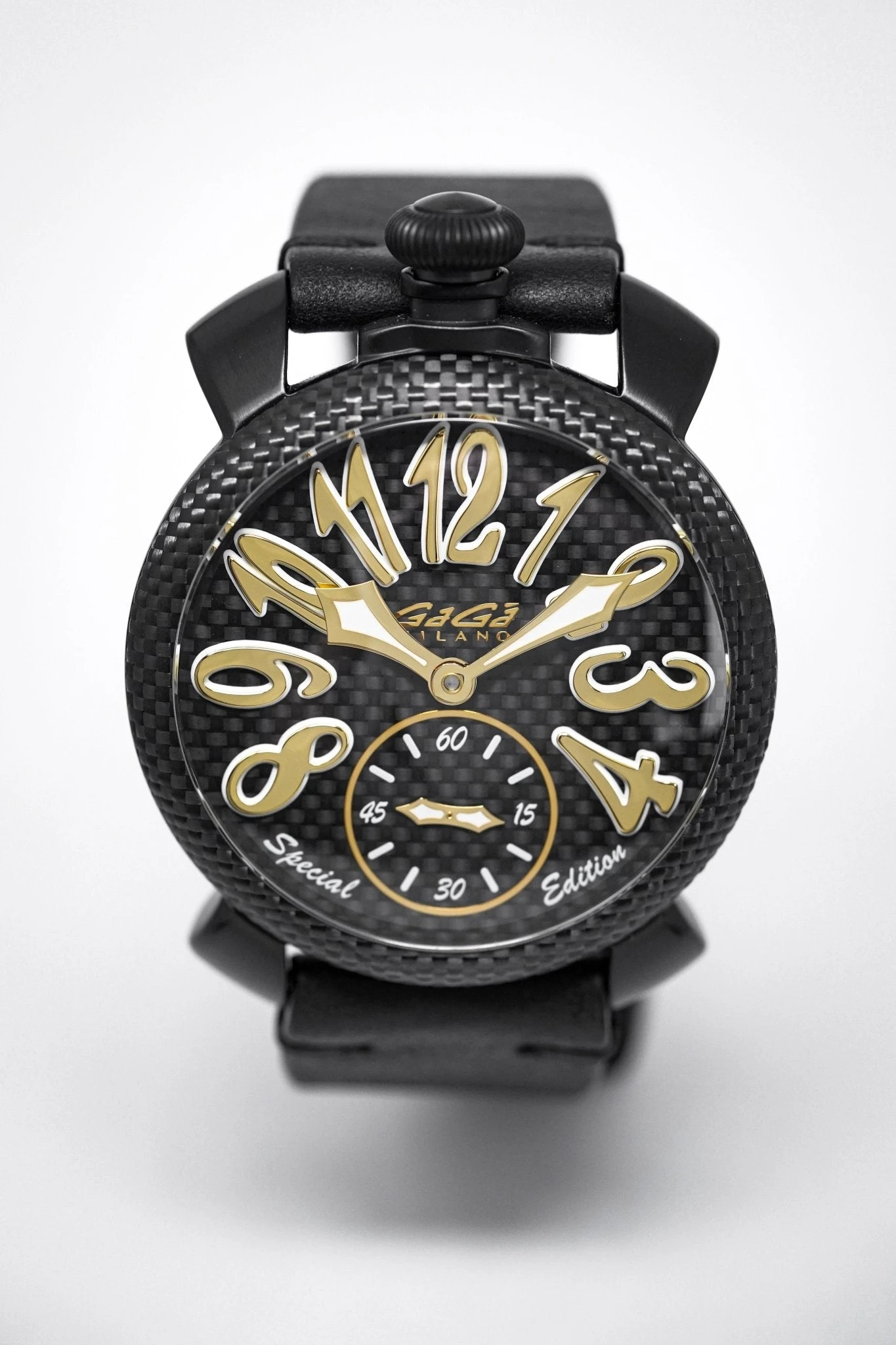 48 mm x 16 mm Black PVD Stainless Steel Case, Black Carbon Fibre Bezel. Sapphire Crystal Case Back which shows off the balance spring, the Wind Mechanism and The GaGà Milano craftsmanship