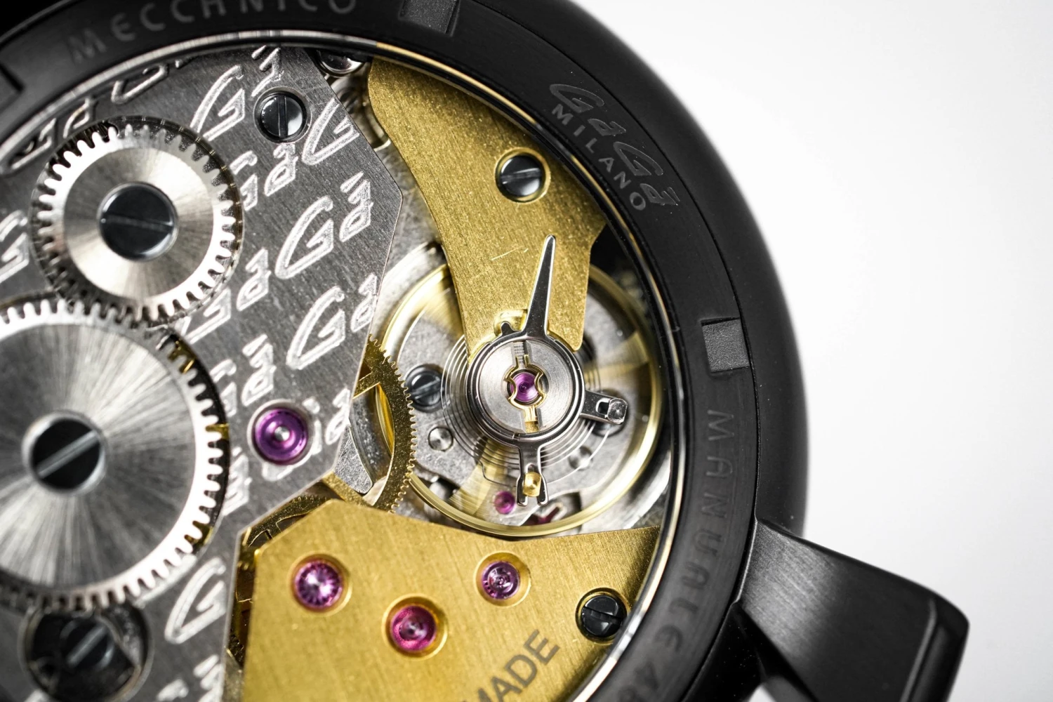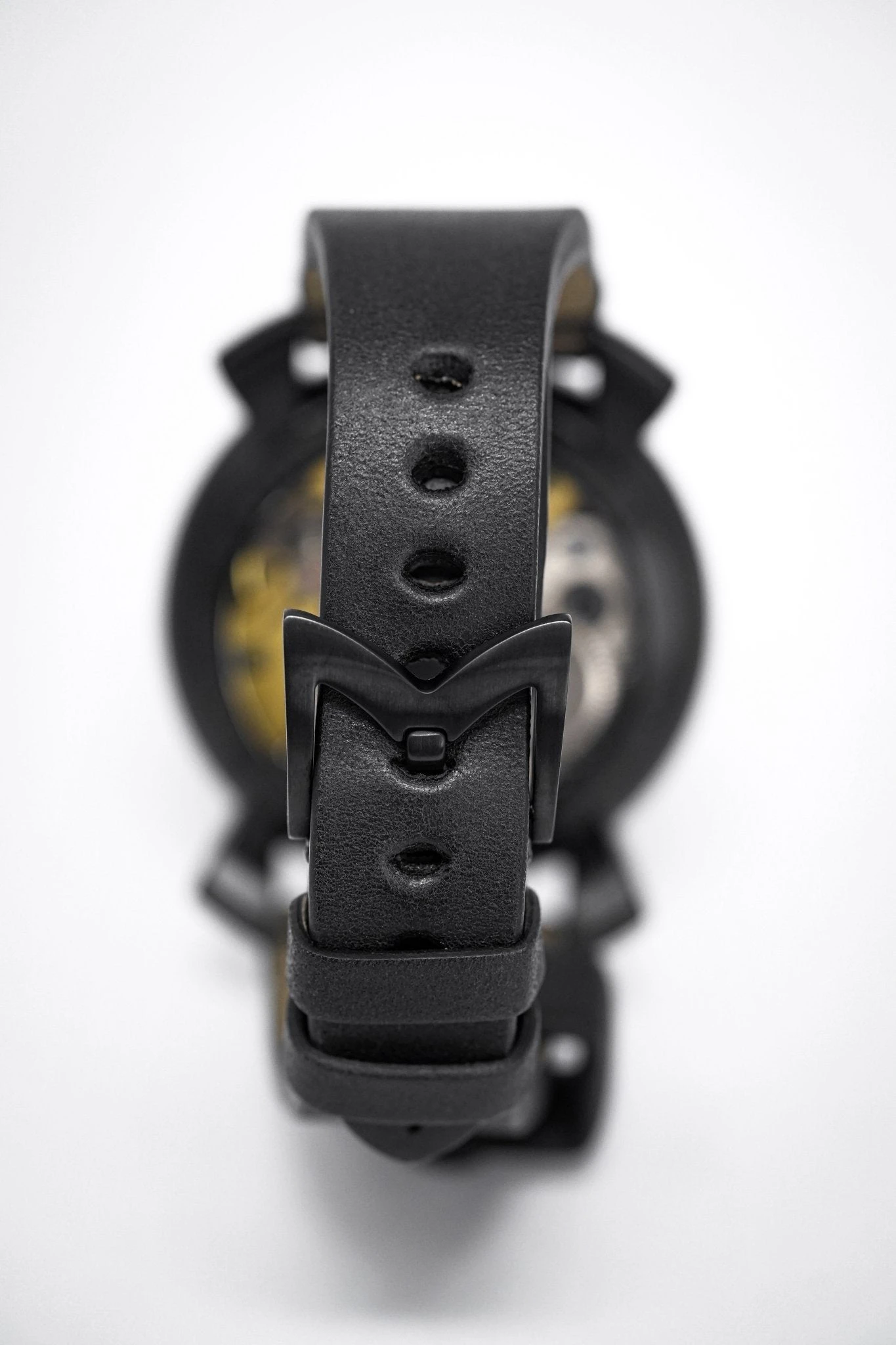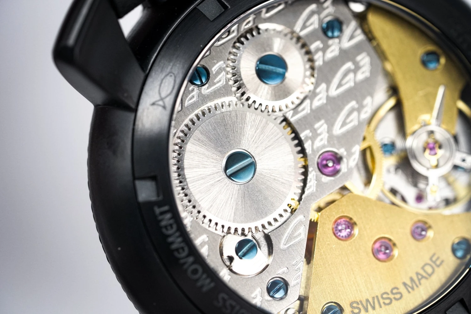 48 mm x 16 mm Black PVD Stainless Steel Case, Black Carbon Fibre Bezel. Sapphire Crystal Case Back which shows off the balance spring, the Wind Mechanism and The GaGà Milano craftsmanship
