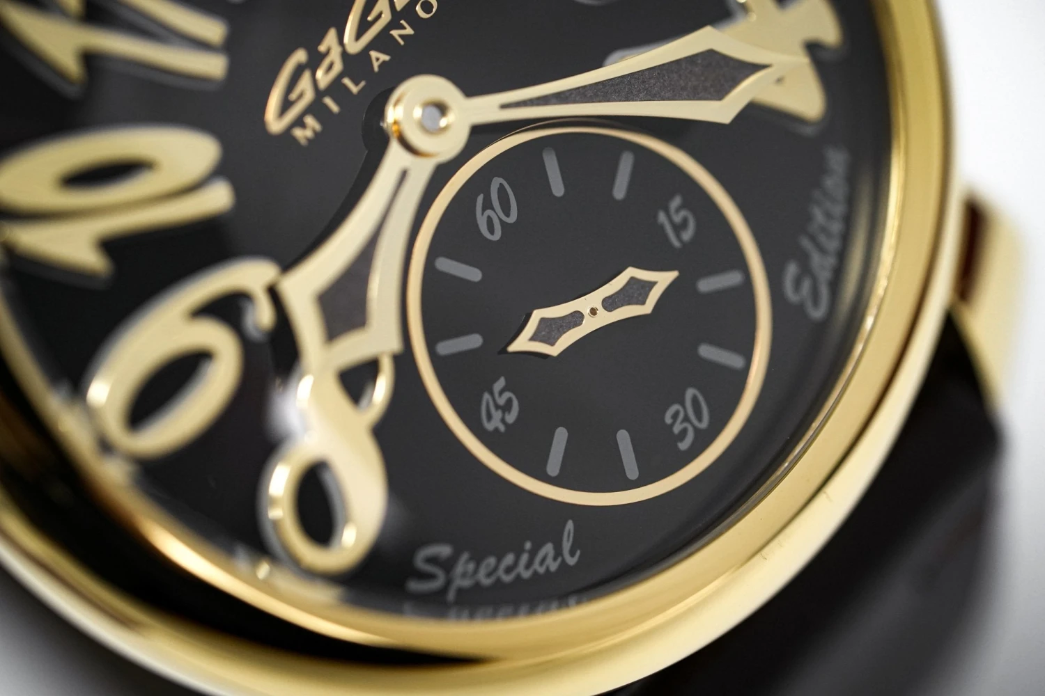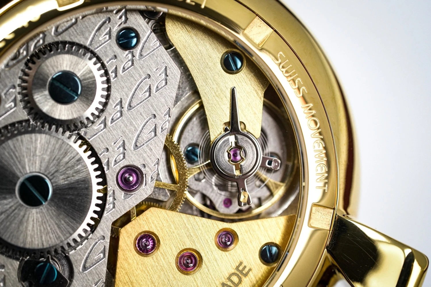 Swiss Made Mechanical, Hand Wound, GaGà 6497 Movement with a power reserve of 36 Hours – 21,600 bph – 21 Jewels – Screw Down Crown at 12 O’Clock – Open Sapphire Crystal Case Back which shows off the balance spring, the Manual Wind Mechanism and The GaGà Milano craftsmanship
