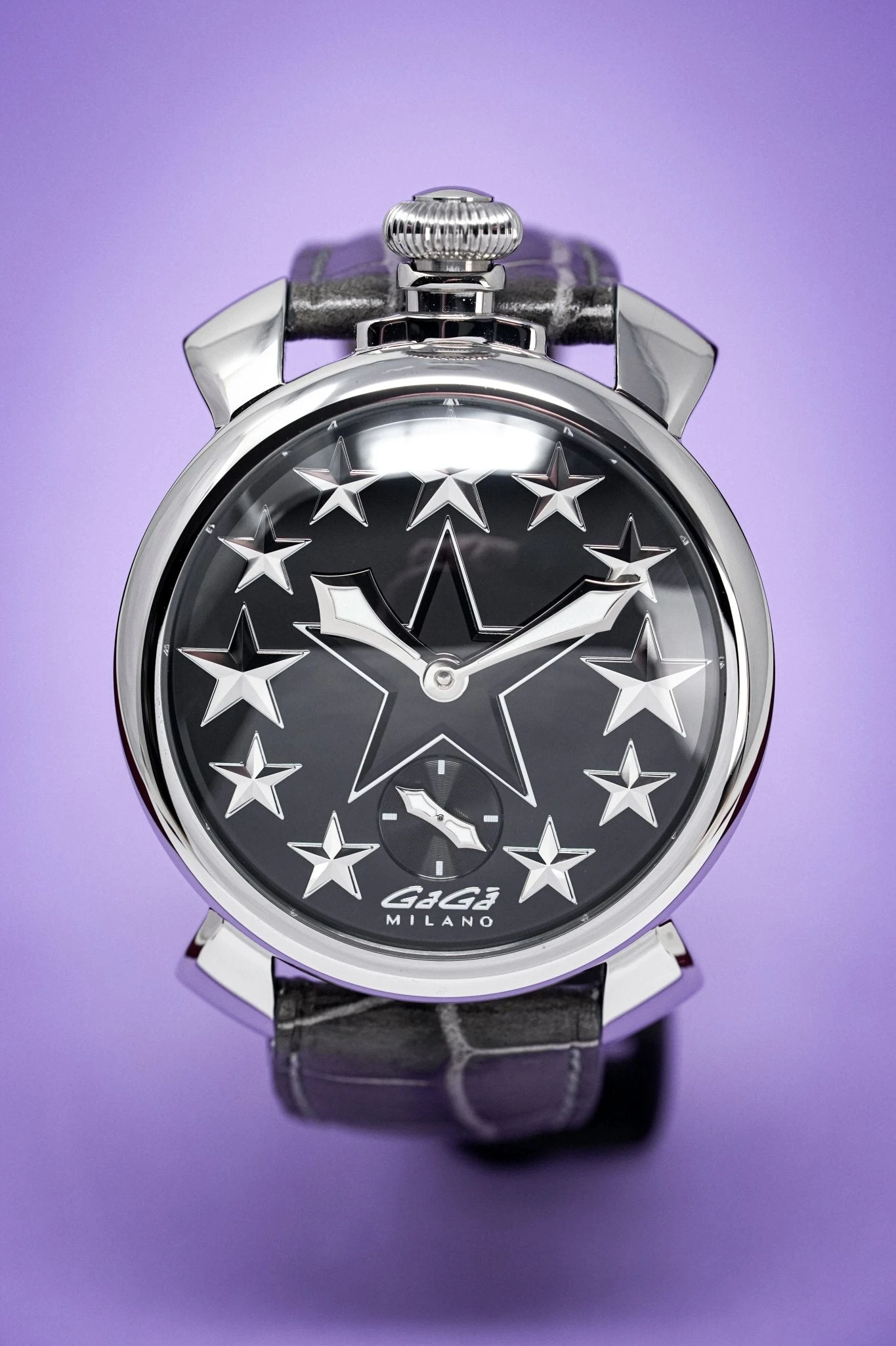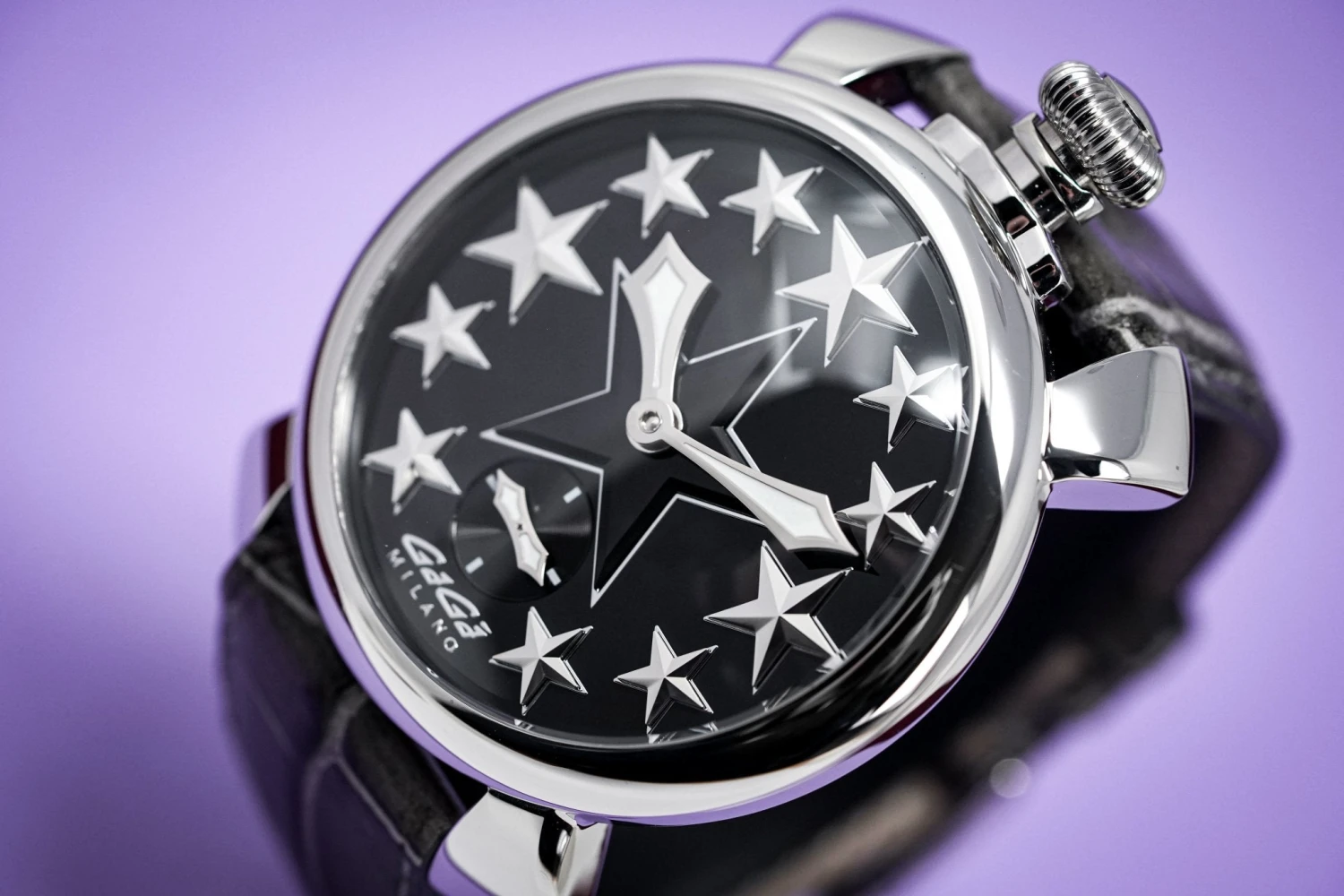 Black Enamel Dial with Stainless Steel Star Markers – Stainless Steel Minute and Hour Hand – Small Seconds at 6 O’Clock