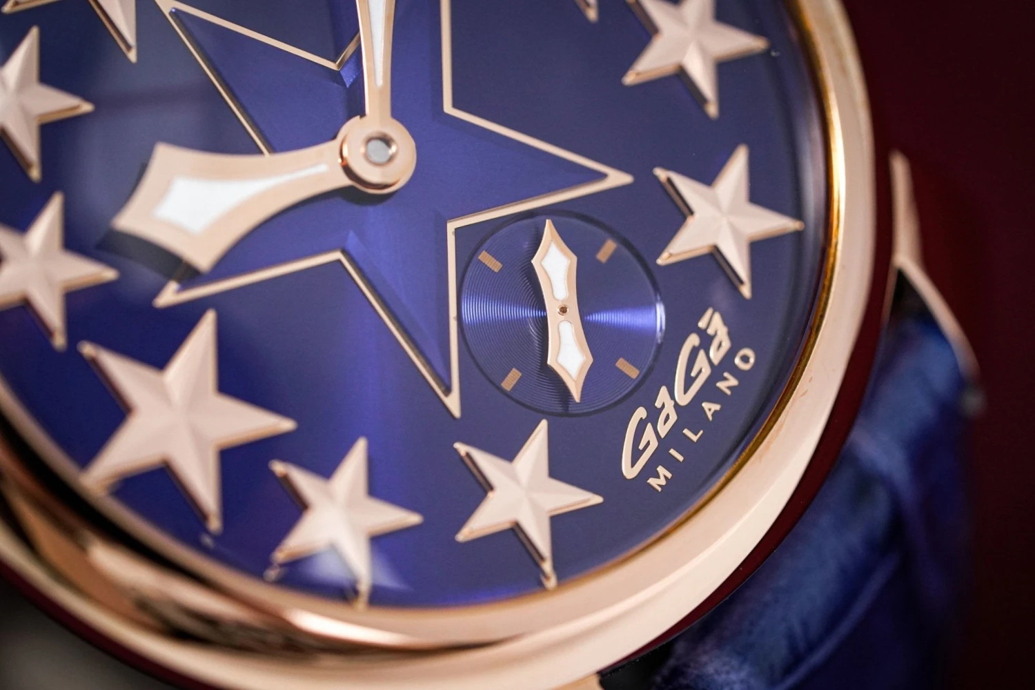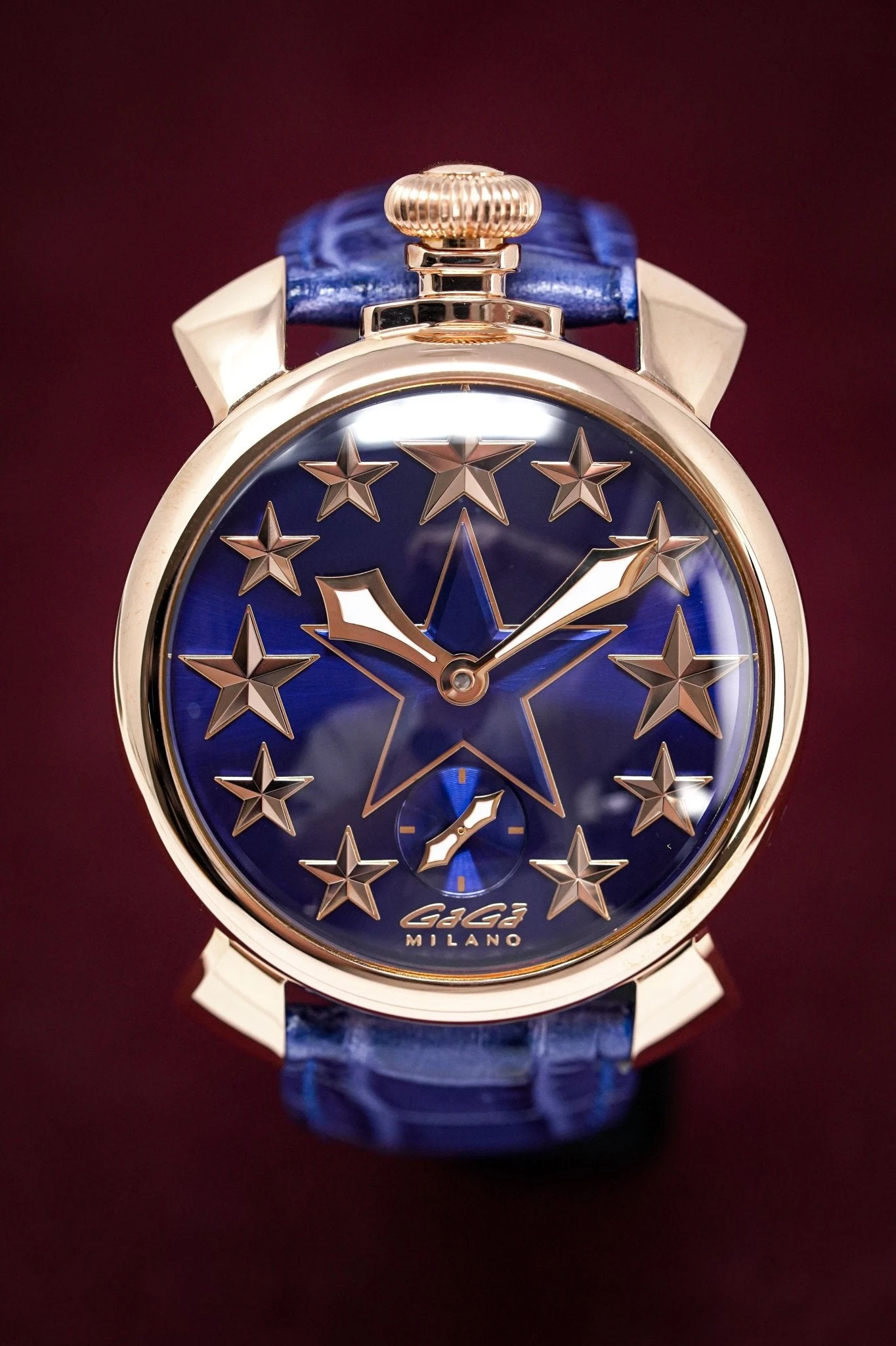 Blue Enamel Dial with Rose Gold PVD Stainless Steel Star Markers – Rose Gold PVD Stainless Steel Minute and Hour Hand – Small Seconds at 6 O’Clock