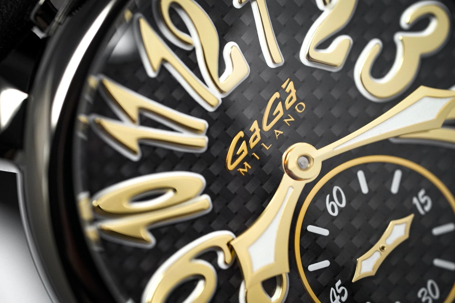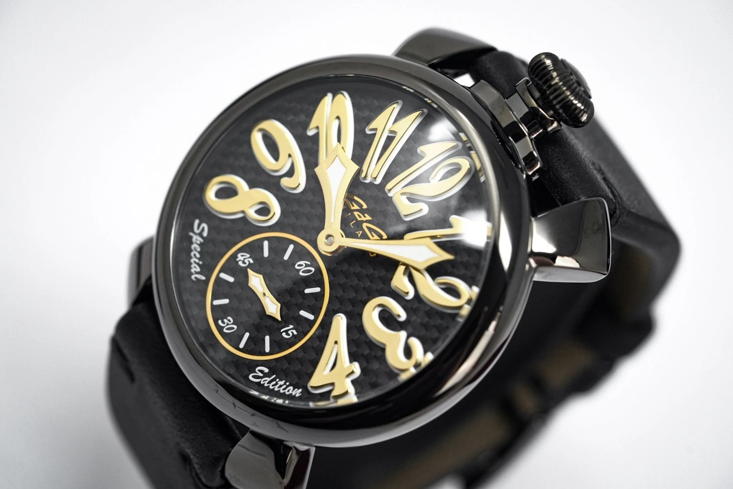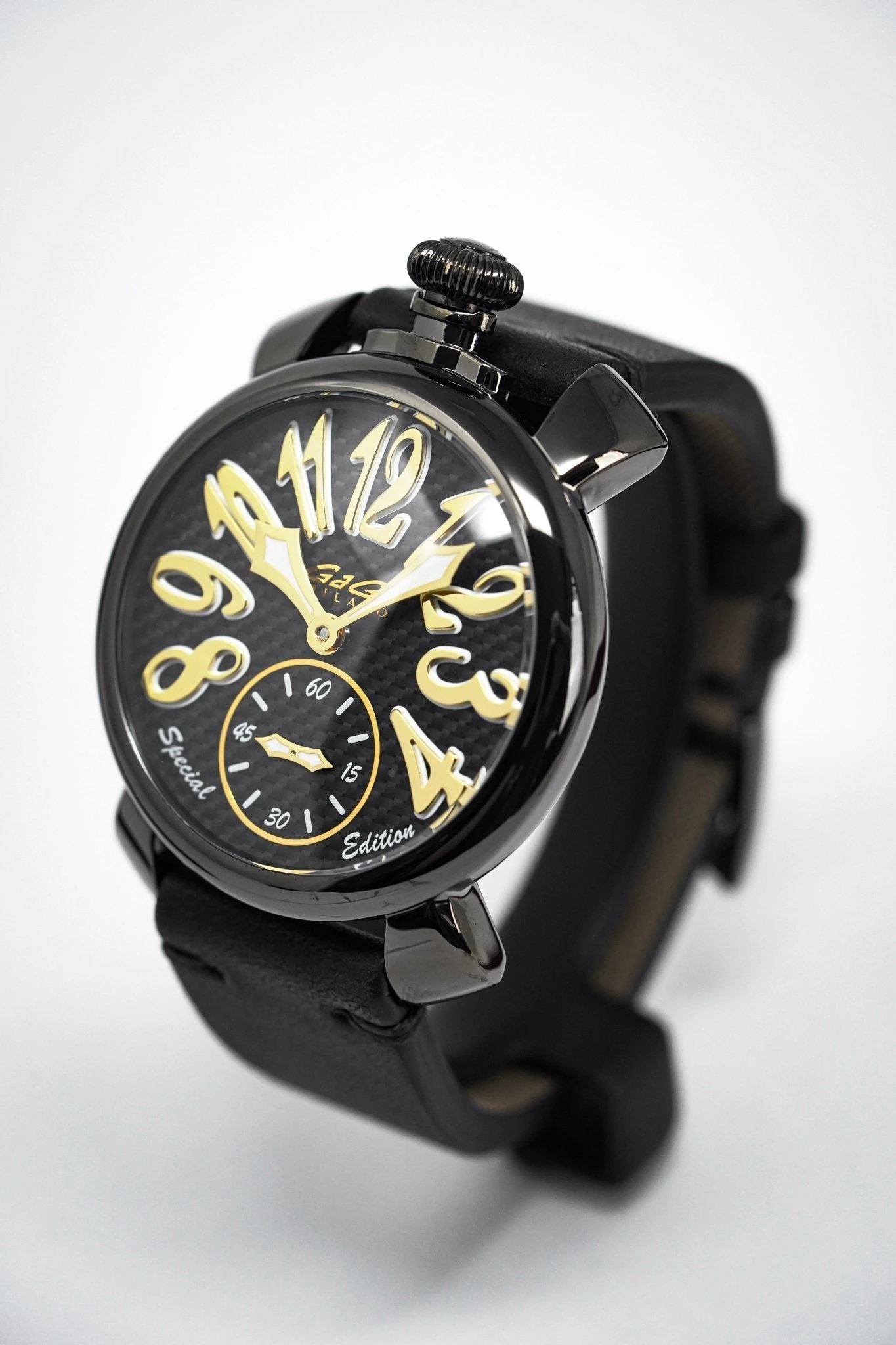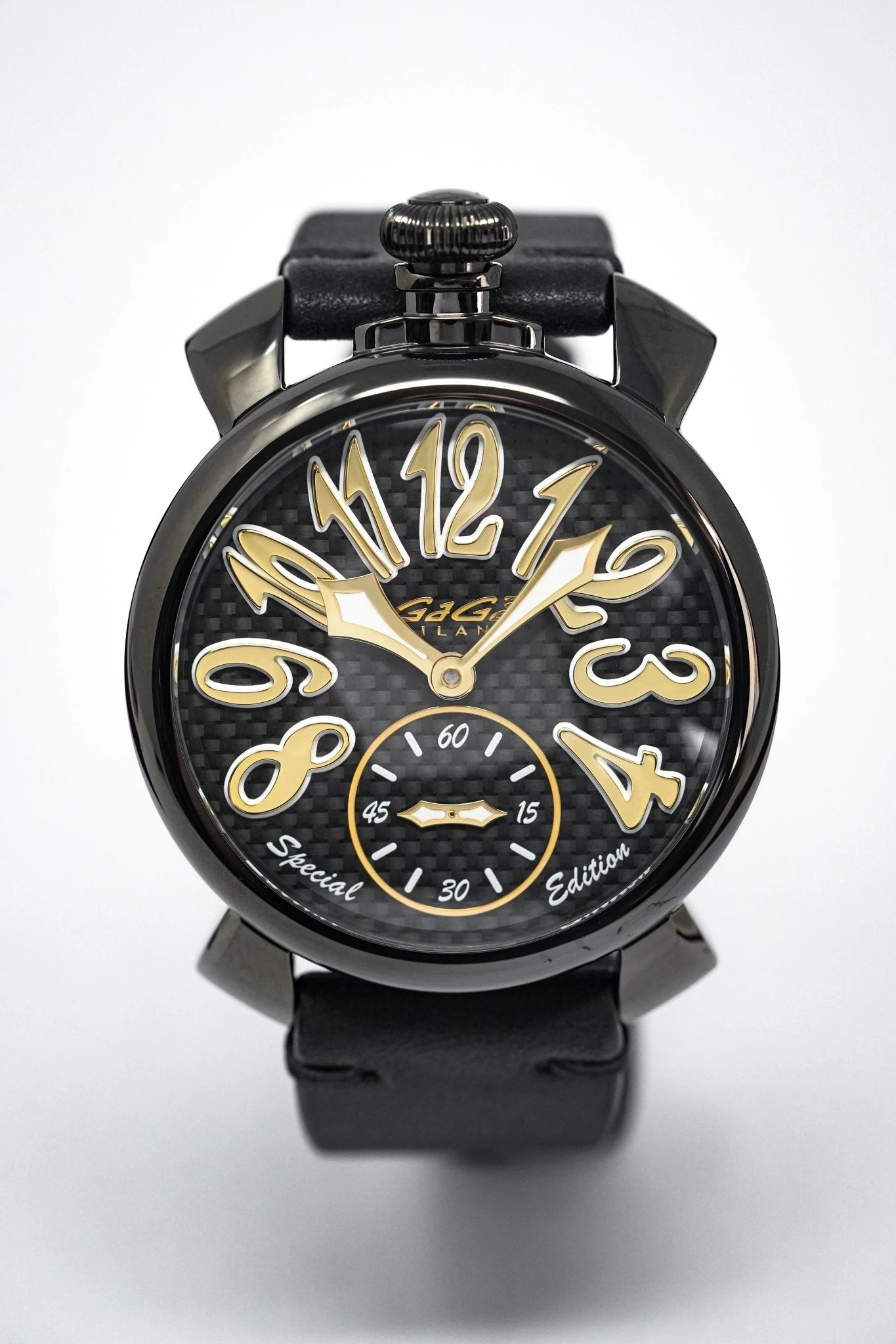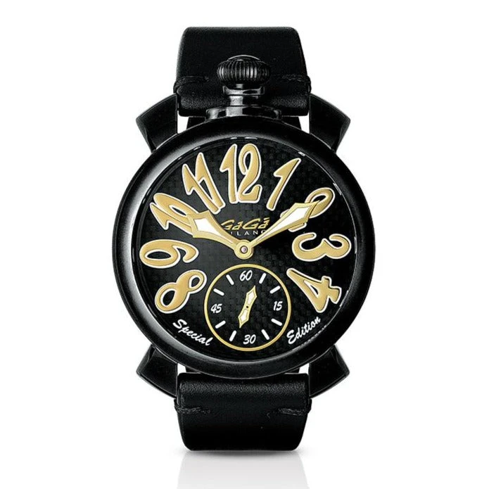 48 mm x 16 mm Black PVD Stainless Steel Case, Black Carbon Fibre Bezel. Sapphire Crystal Case Back which shows off the balance spring, the Wind Mechanism and The GaGà Milano craftsmanship