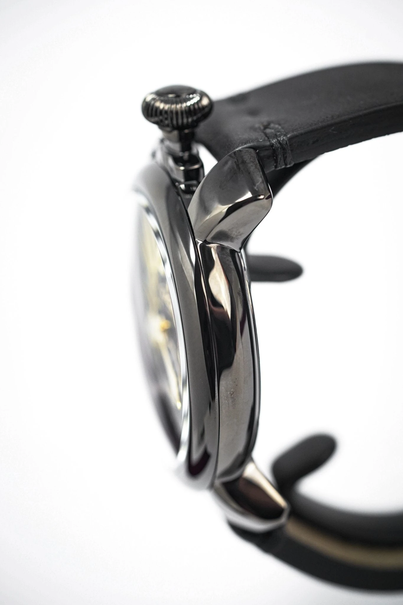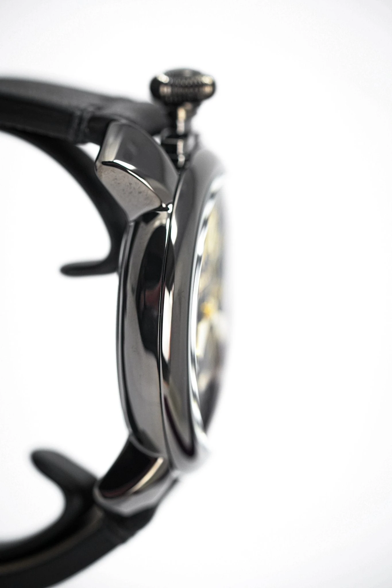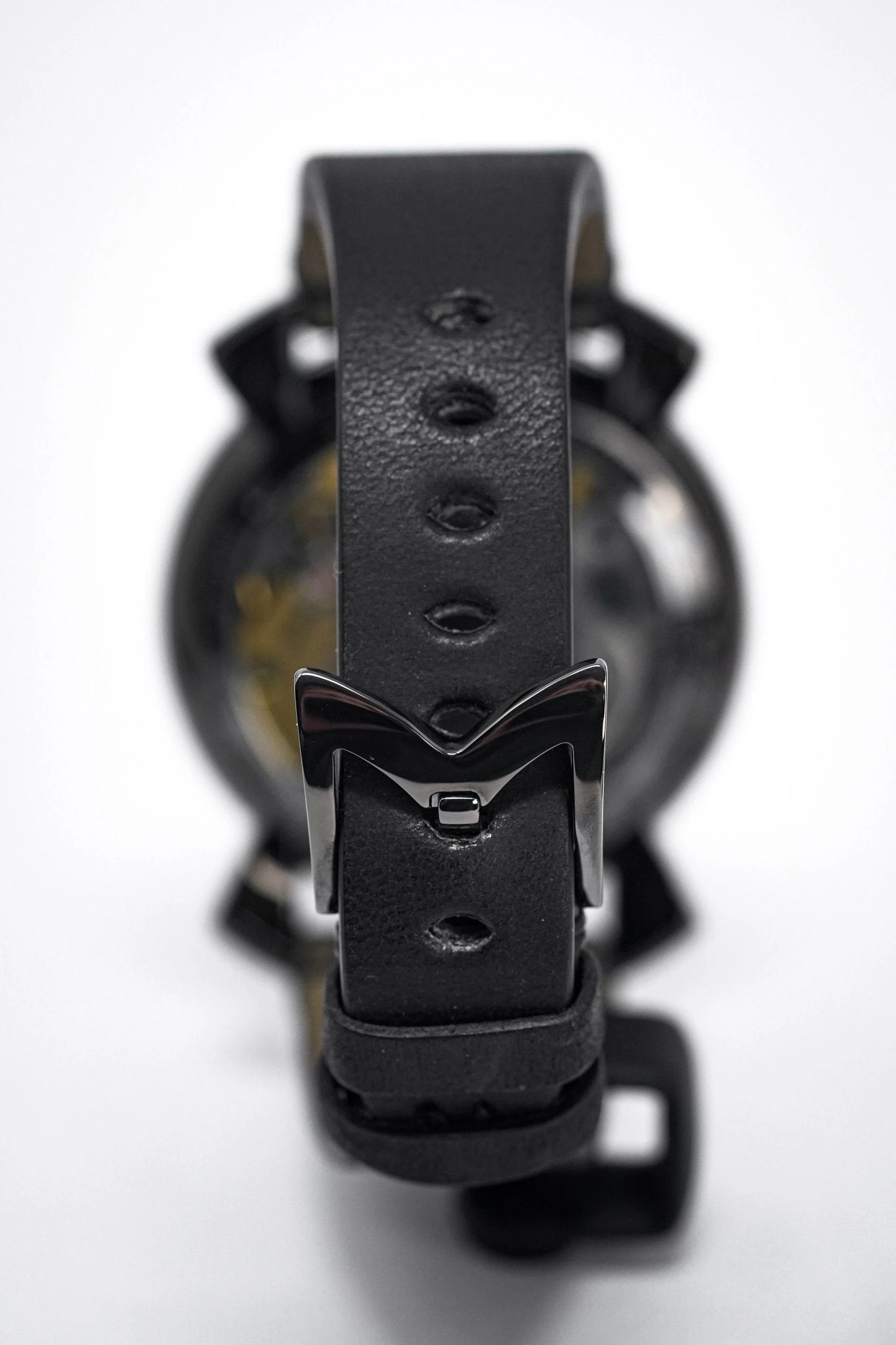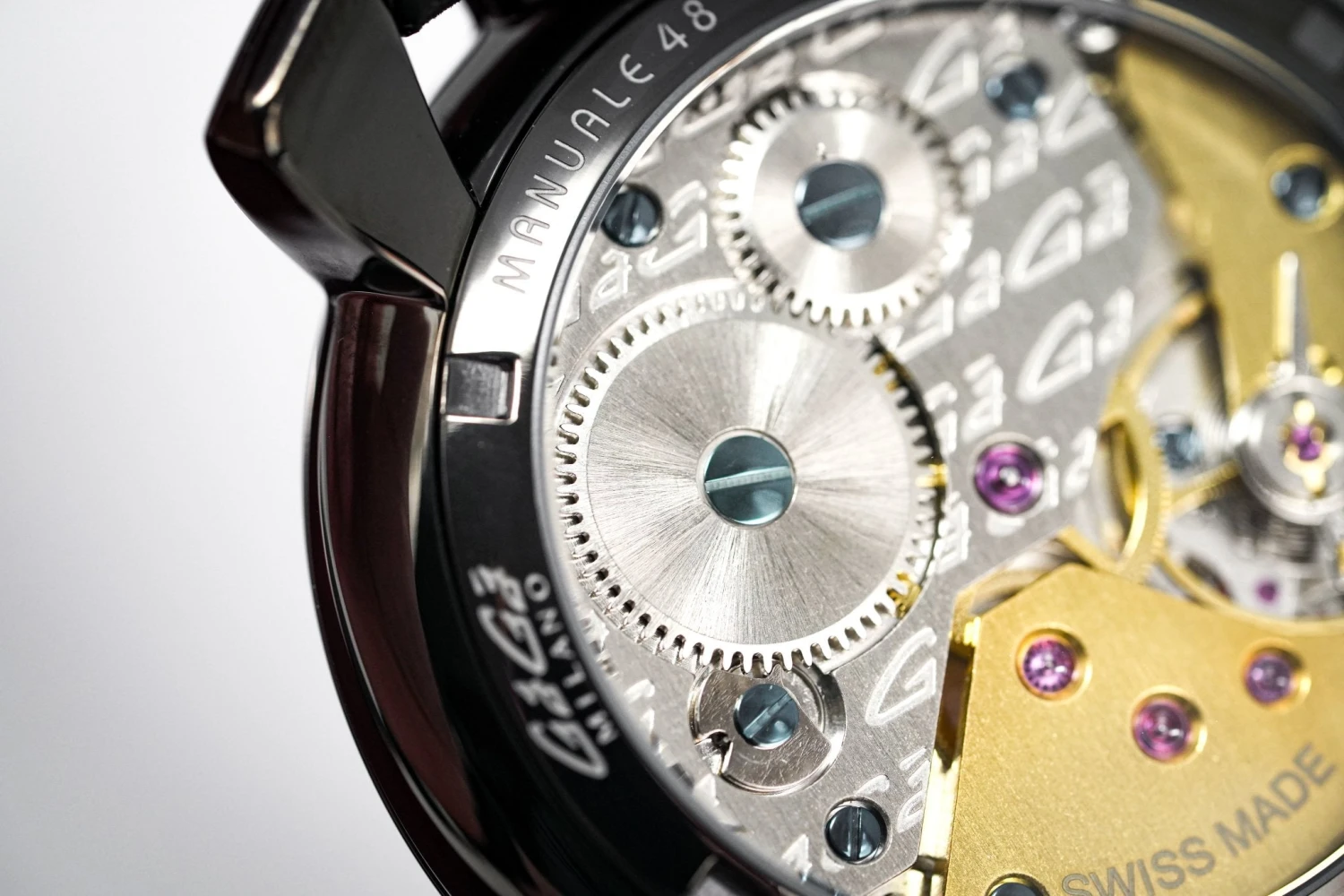 48 mm x 16 mm Black PVD Stainless Steel Case, Black Carbon Fibre Bezel. Sapphire Crystal Case Back which shows off the balance spring, the Wind Mechanism and The GaGà Milano craftsmanship