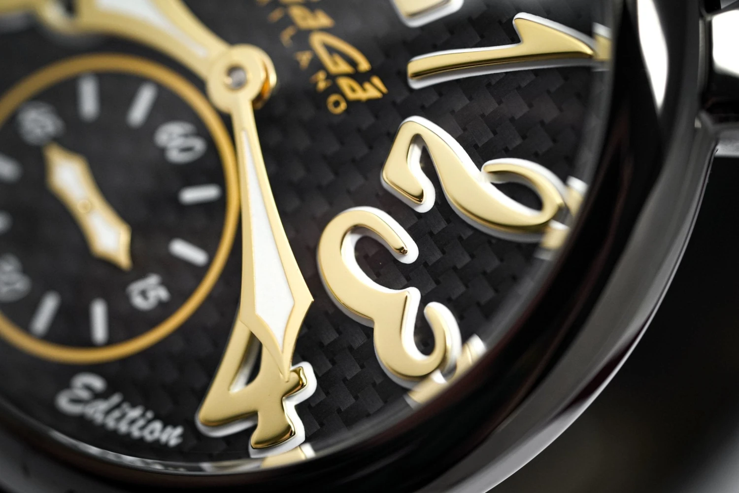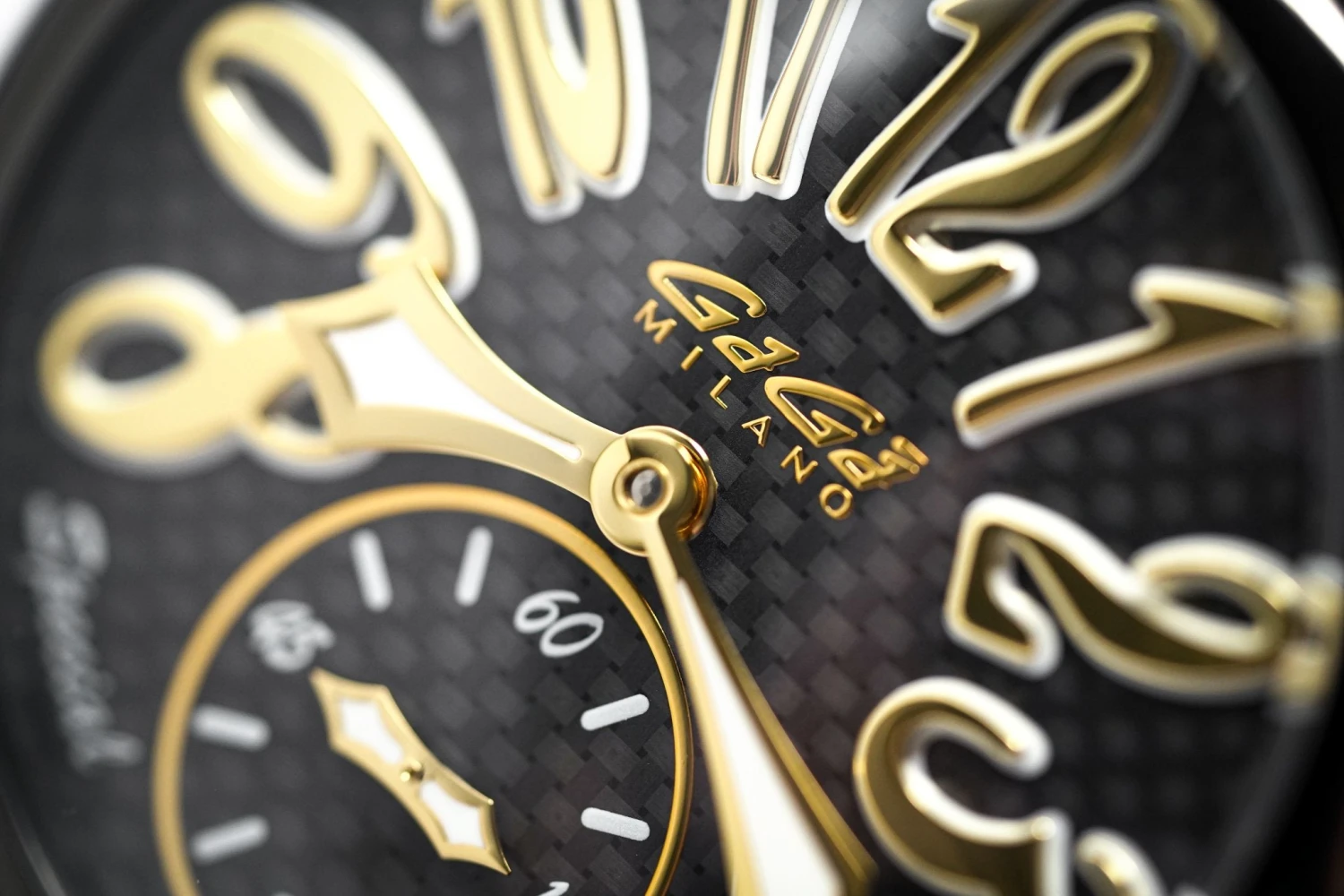 Carbon Dial with Gold Plated Steel Markers and Hands.