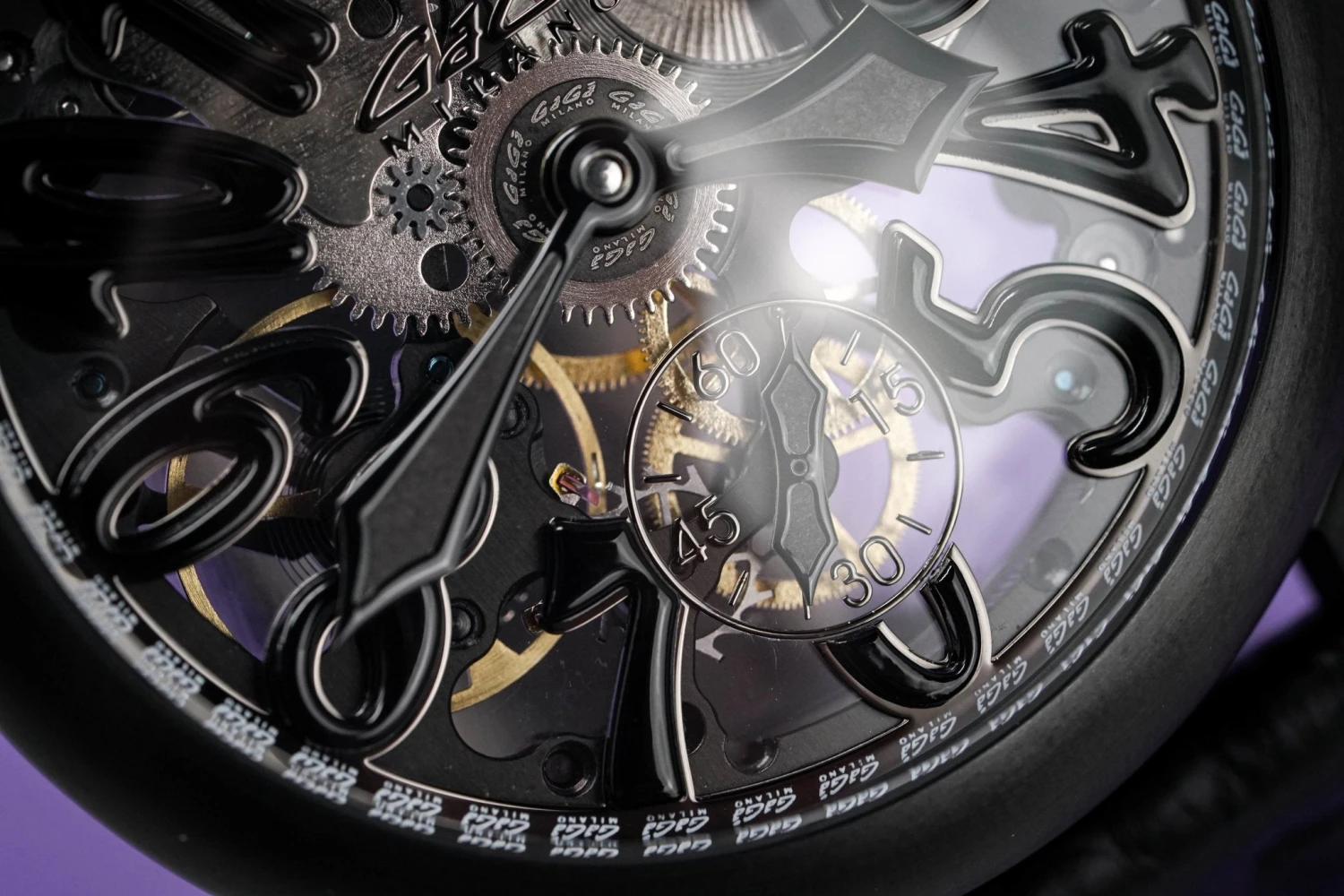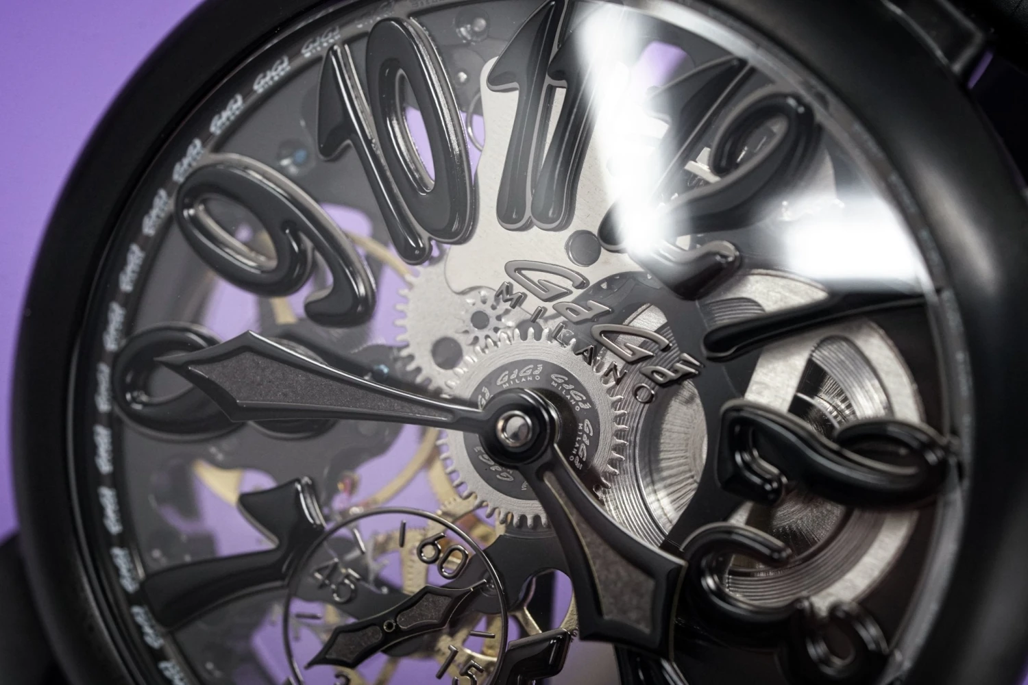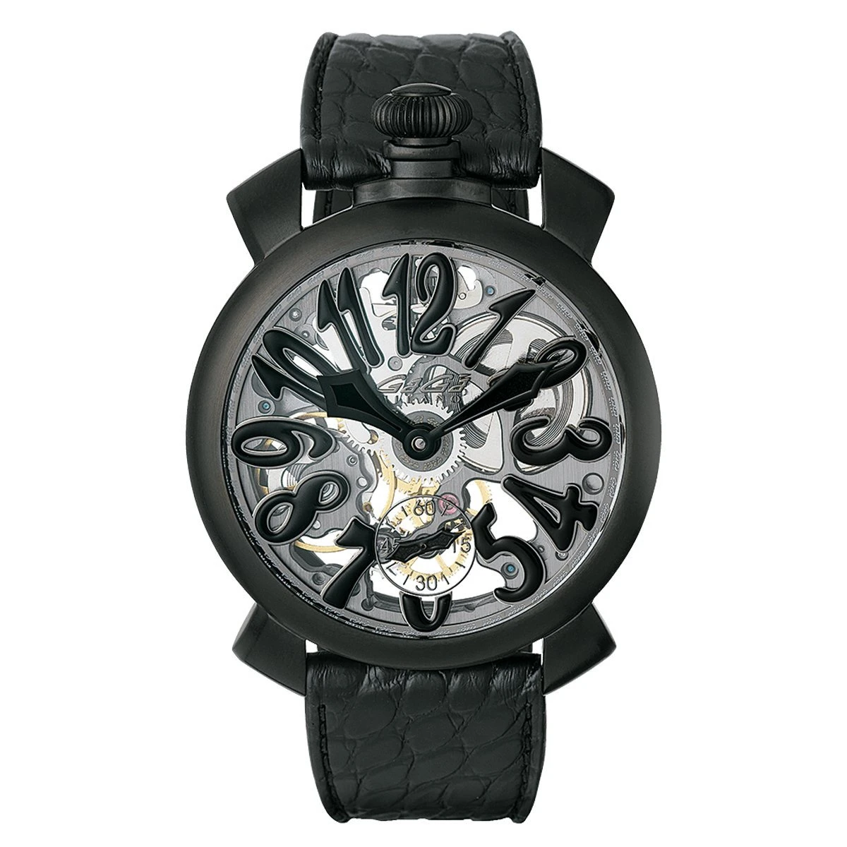 Skeleton Dial with Black Arabic Markers – Black PVD Stainless Steel Minute and Hour Hand – Small Seconds at 6 O’Clock