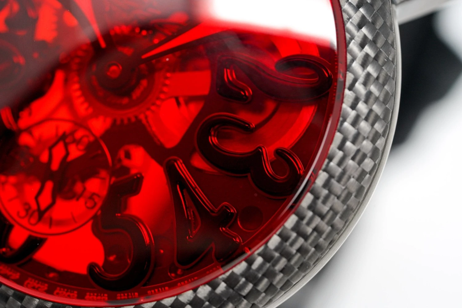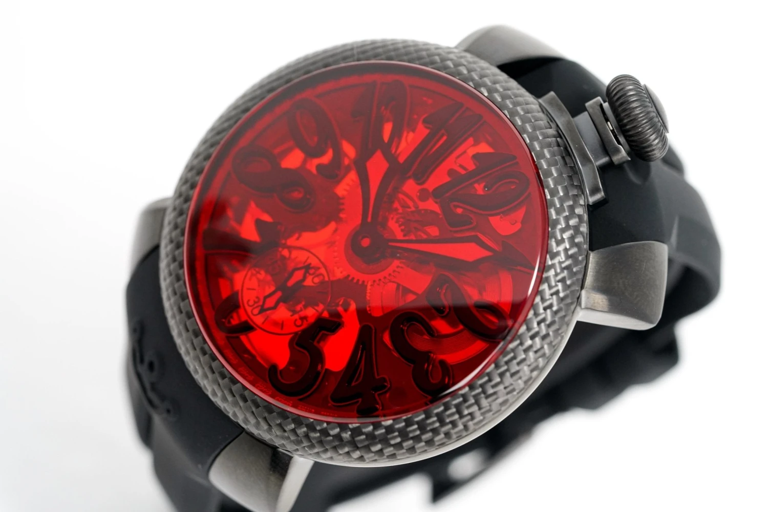 48 x 16mm Black PVD Stainless Steel Case – Domed Anti-Reflective Red Sapphire Crystal And Carbon Fibre Bezel.