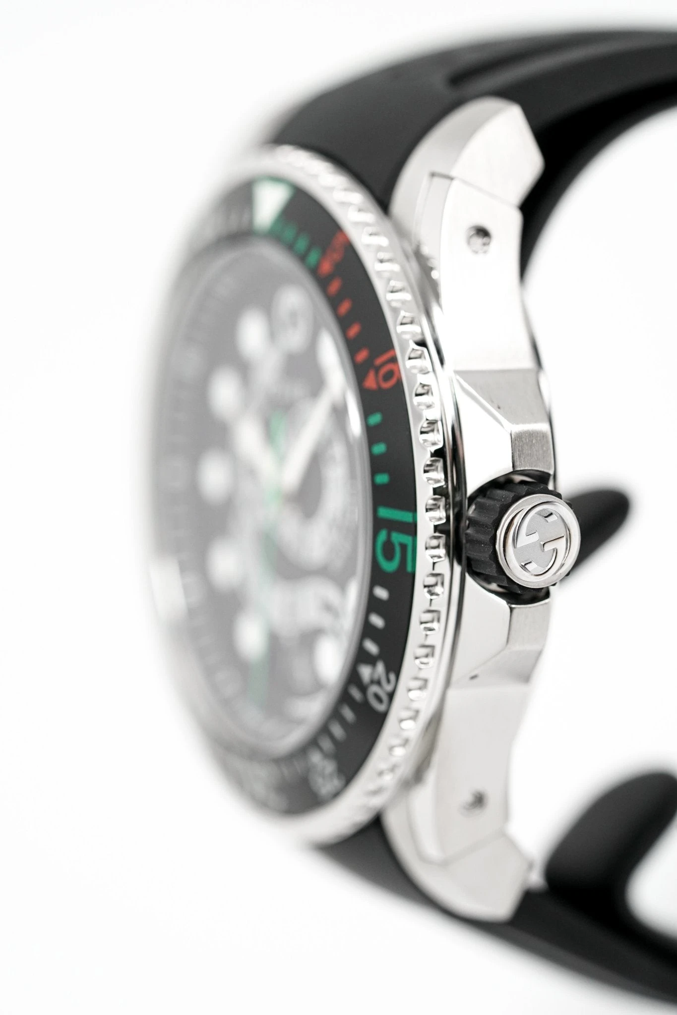 20mm Black Rubber Two-Piece Strap with Gucci Branded. Stainless Steel Push Deployment Clasp.