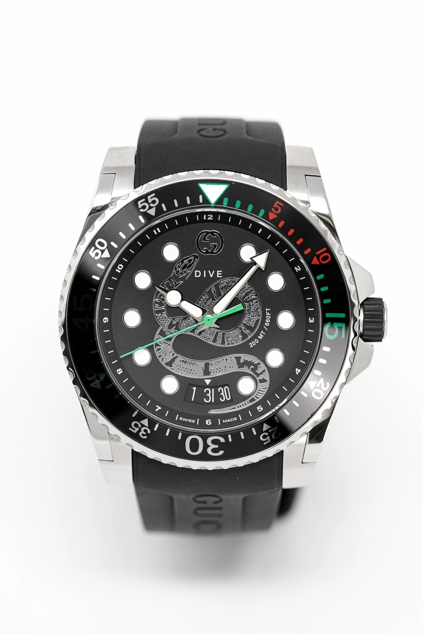 Black Dial. Super Luminova Stainless Steel Hands and Indexes. Green Seconds Hand. Date Window at 6.