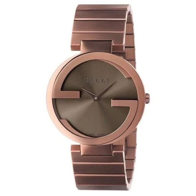 37mm x 8mm Brown PVD Plated Stainless Steel Case with Interlocking Gucci Logo Bezel. Scratch Resistant Sapphire Crystal Glass. Push-Pull Crown. Solid Caseback.