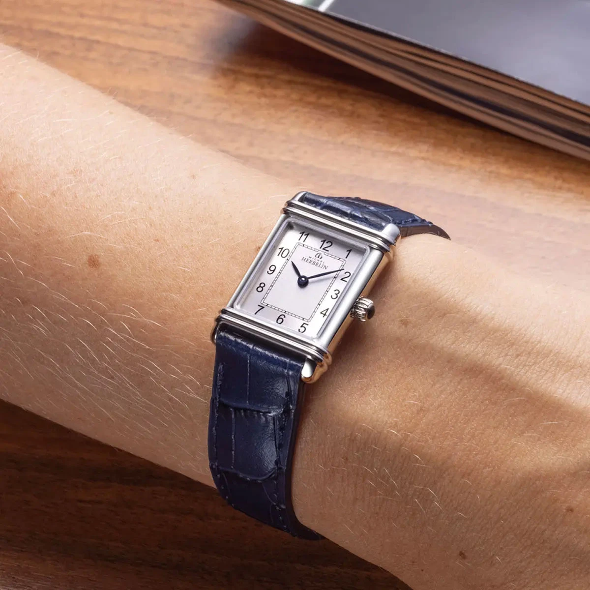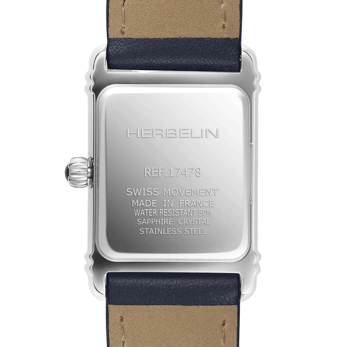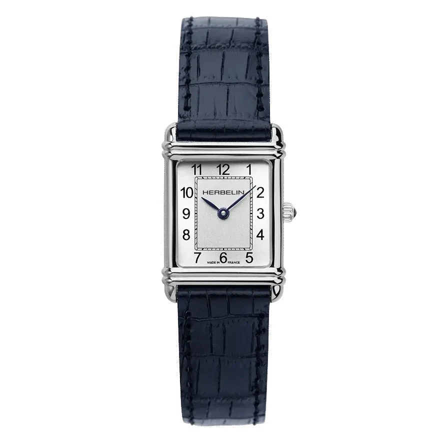 The Art Deco line draws inspiration from the early designs of Michel Herbelin. Adorned with a luxurious blue crocodile-style leather band, this timepiece guarantees an elegant and sophisticated appearance.