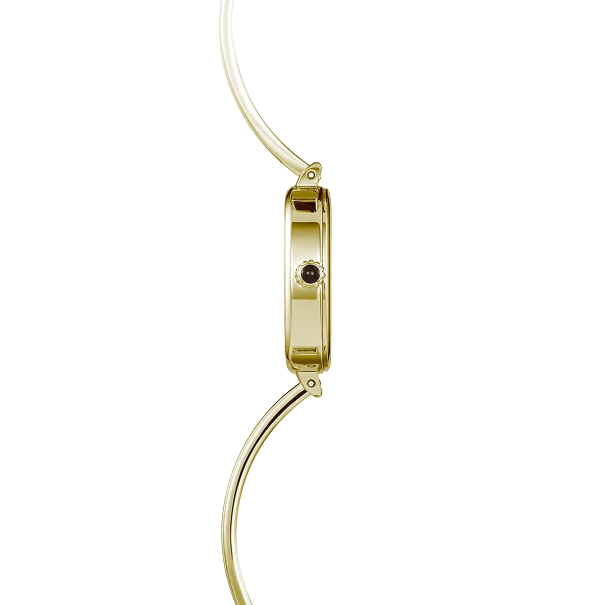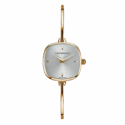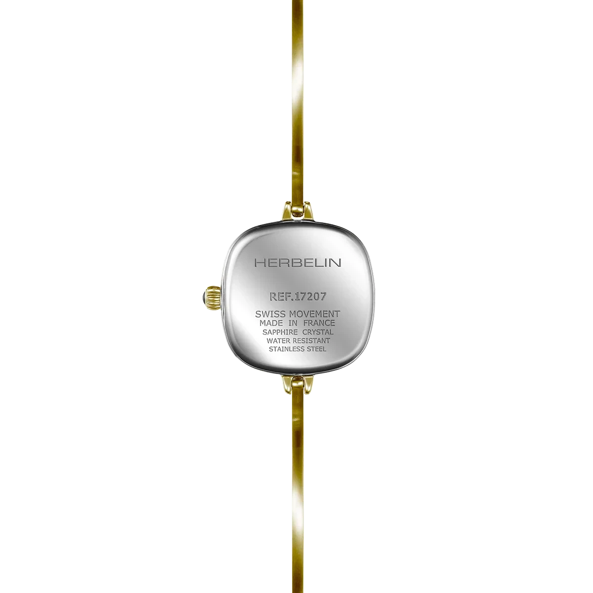 The Herbelin Fil Cushion Gold Bangle Ladies Watch 17207BP11 is a stunning timepiece that combines sophistication with modern design. Featuring a yellow gold PVD finish, the elegant square case with rounded corners perfectly complements the genuine mother-of-pearl dial, exuding a timeless appeal. Measuring 24mm by 24mm with a slim profile of 6mm thickness, this watch sits comfortably on the wrist, making it ideal for both casual and formal occasions.