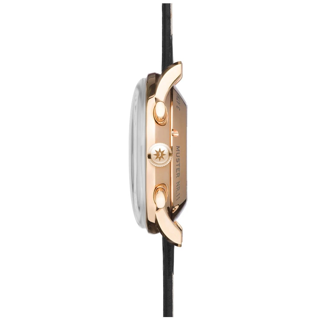 Dynamic or elegant? An irrelevant thought for the Meister Chronoscope. After all, this watch deftly fuses vintage charm with athletic features. The stainless steel case houses the high quality automatic movement which drives the watch’s timekeeping. The silver white dial is beautifully laid out with the 3 Chronograph sub dials and the large Day/Date windows giving a subtle balance. The auxiliary dial’s distinctive, bowl-like dimples are a defining hallmark of the Meister line. The watch is finished with a classic black stitched strap offering the wearer elegant style at a glance….