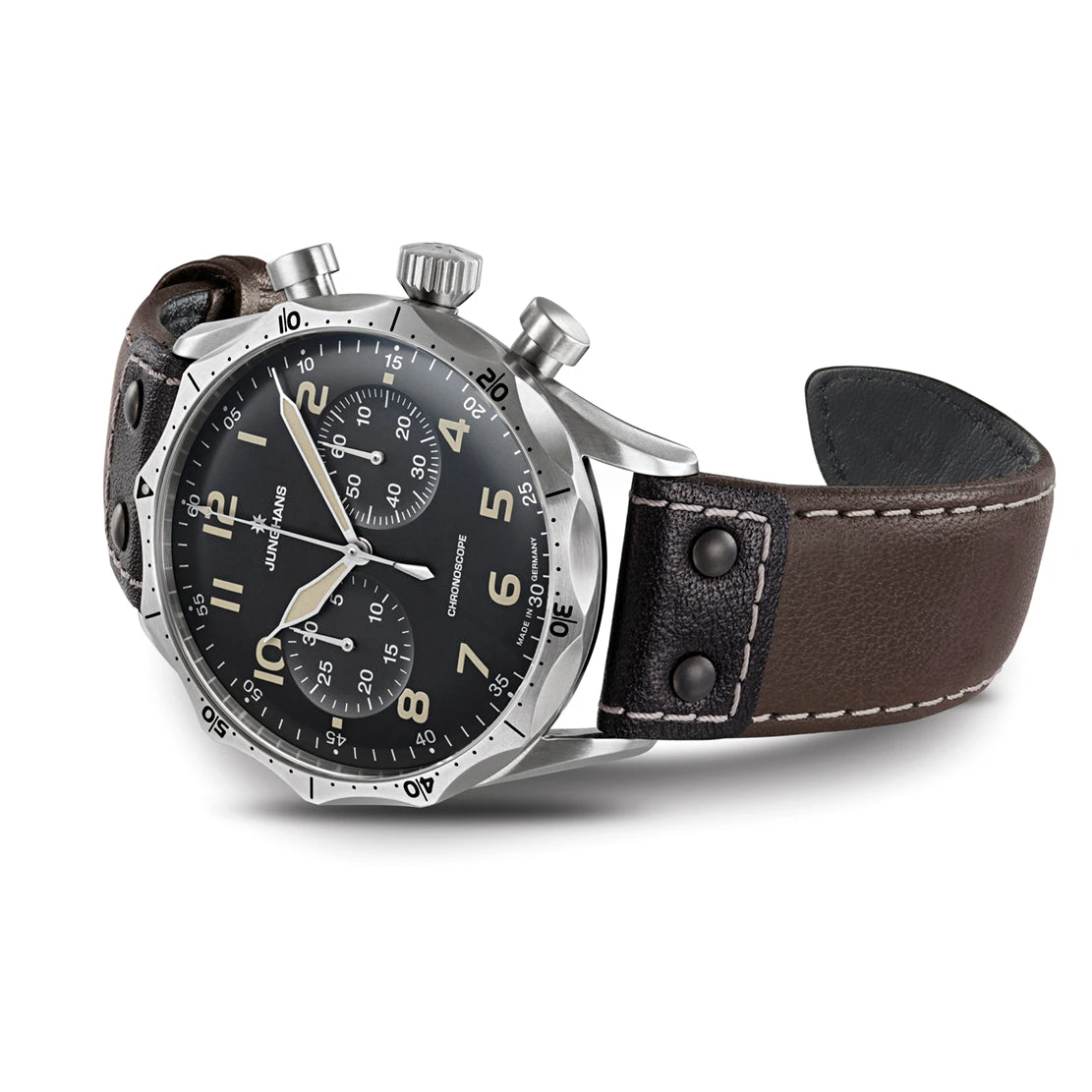In the 1930s, Junghans were manufacturing control panel instruments for aeroplanes and airships, ultimately devising a legendary pilot chronograph for the German Armed Forces in the 1950s. The fascination with aviation is clearly evident in the Meister Pilot: Distinctive luminescent numerals and hands on the dial ensure optimum readability. The ergonomically designed bezel provides exceptional grip, as well as a unique look.