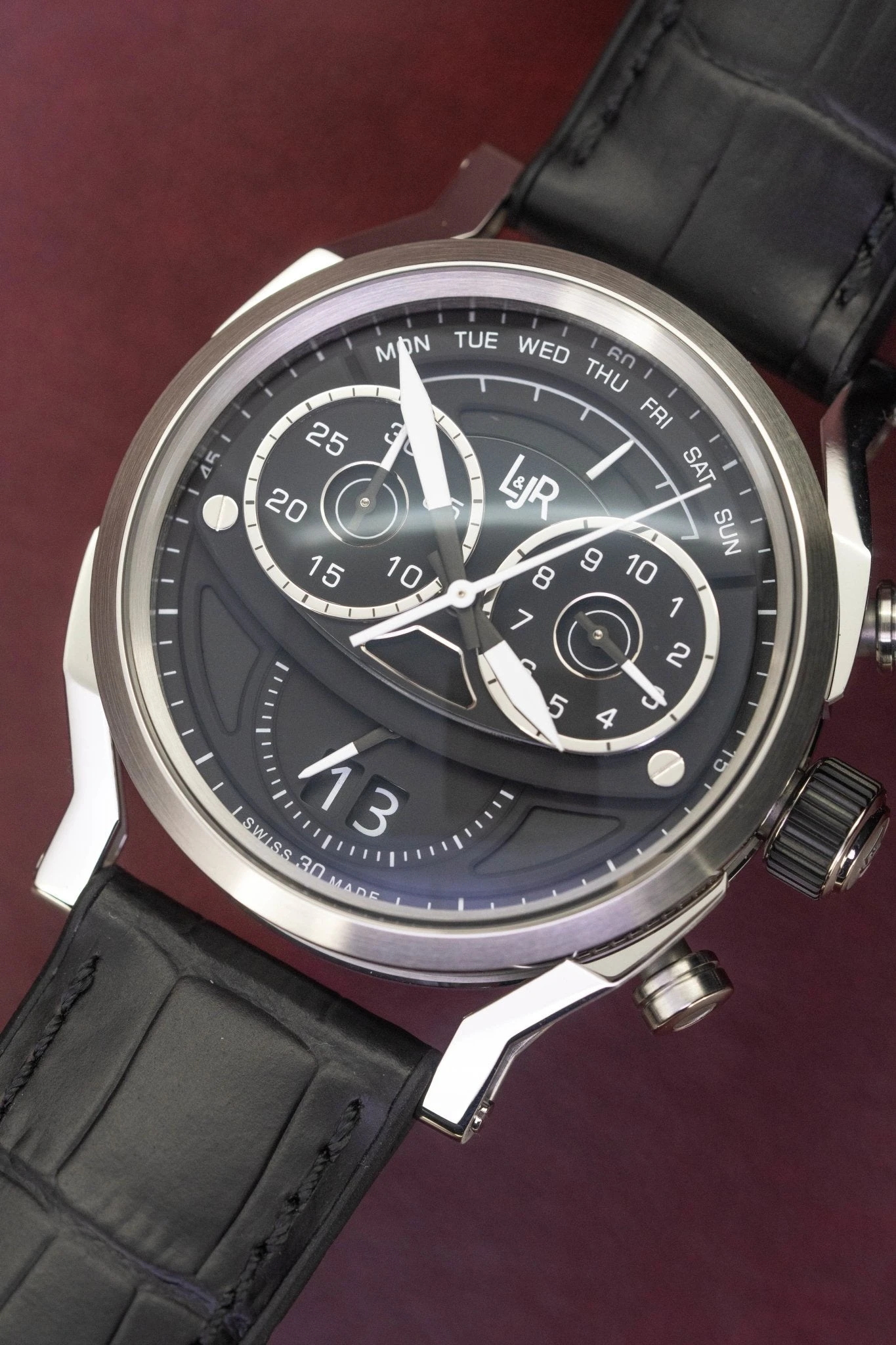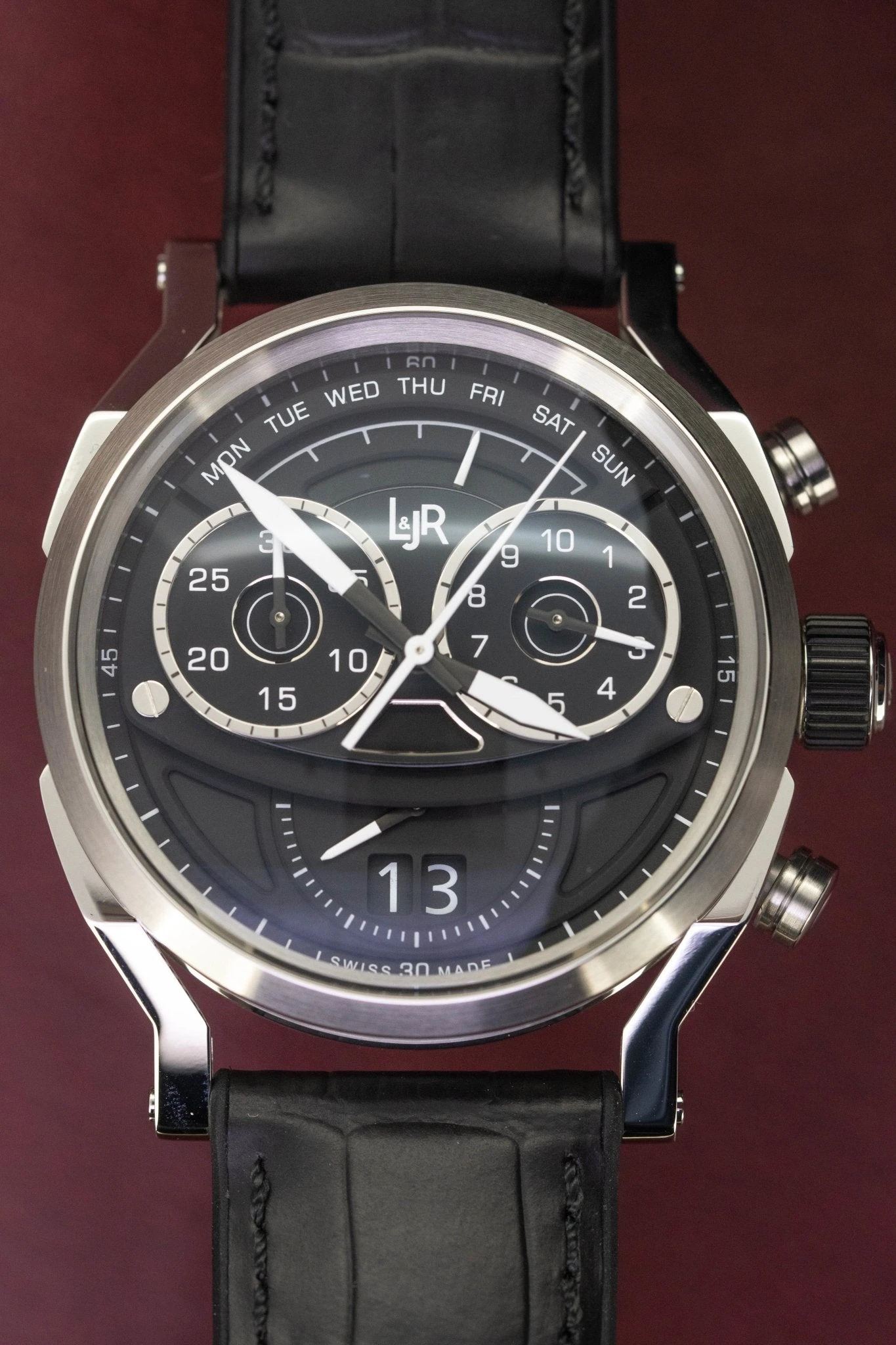 Swiss Made Analogue Quartz Movement Ronda Caliber 8040.N Day Retrograde – Mastertech Line – Gold Plated – 13 Jewels – Hour, minute, 1/10 Seconds Timer at 3 O’Clock, small second at 6 O’Clock, 30 Minute Timer at 9 O’Clock, big date, retrograde for the days